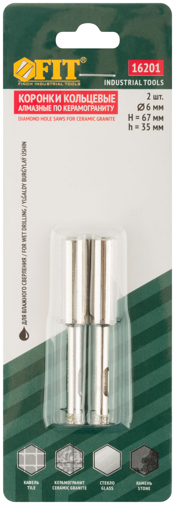 Коронки кольцевые по керамограниту, камню и кафелю алмазные, набор 2 шт., 6х65 мм