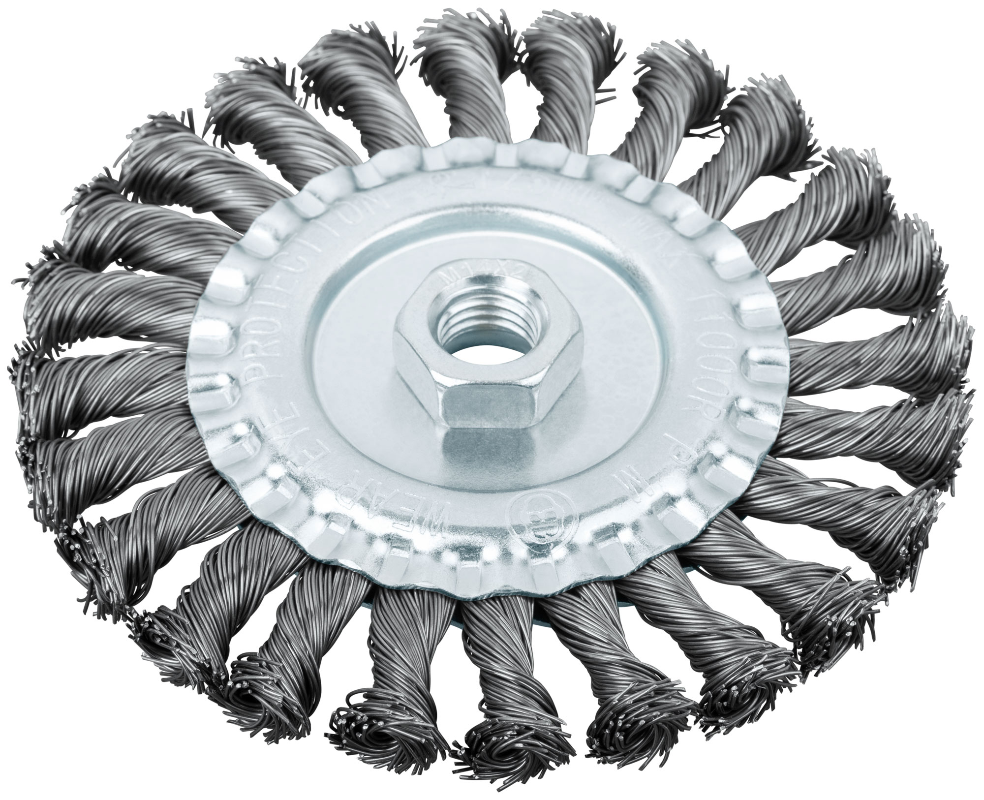 Тип «Колесо», гайка М14. Для УШМ. Витая стальная проволока. Материал: инструментальная сталь. Упаковка: картонная коробка.