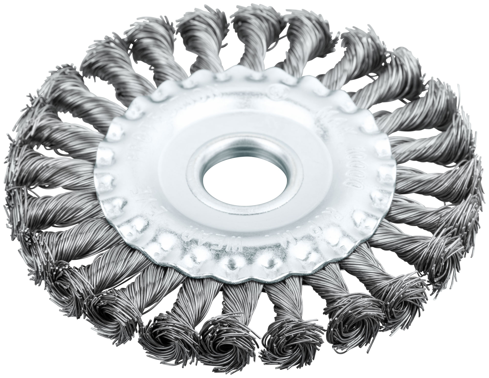 Тип «колесо». Для УШМ. Витая стальная проволока. Посадочный диаметр – 22,2 мм. Упаковка: картонная коробка.