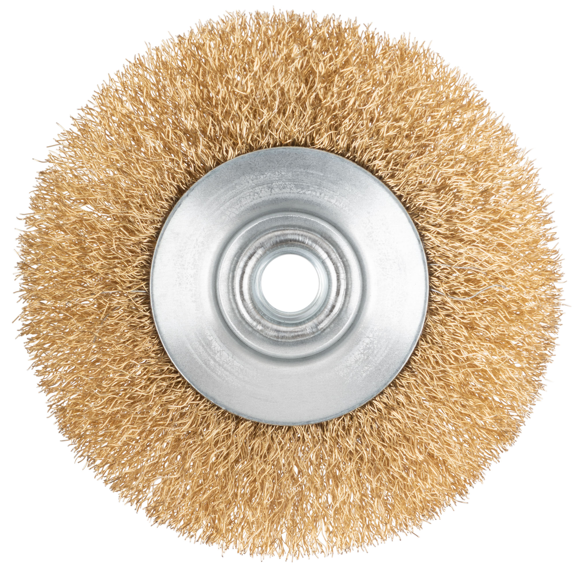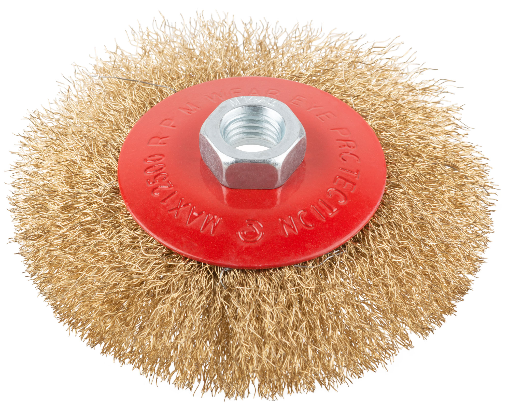 Тип "колесо", с наклоном. Для УШМ. Гайка М14. Материал: стальная латунированная волнистая проволока. Упаковка: картонная коробка.