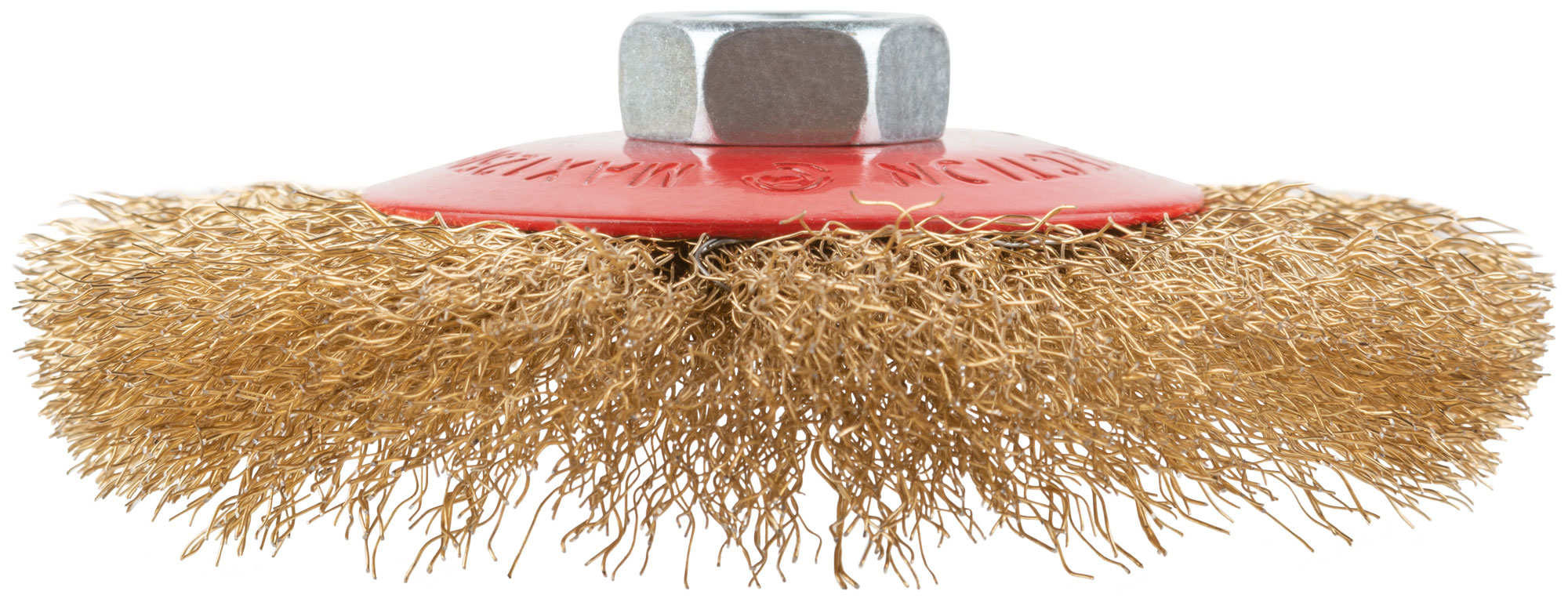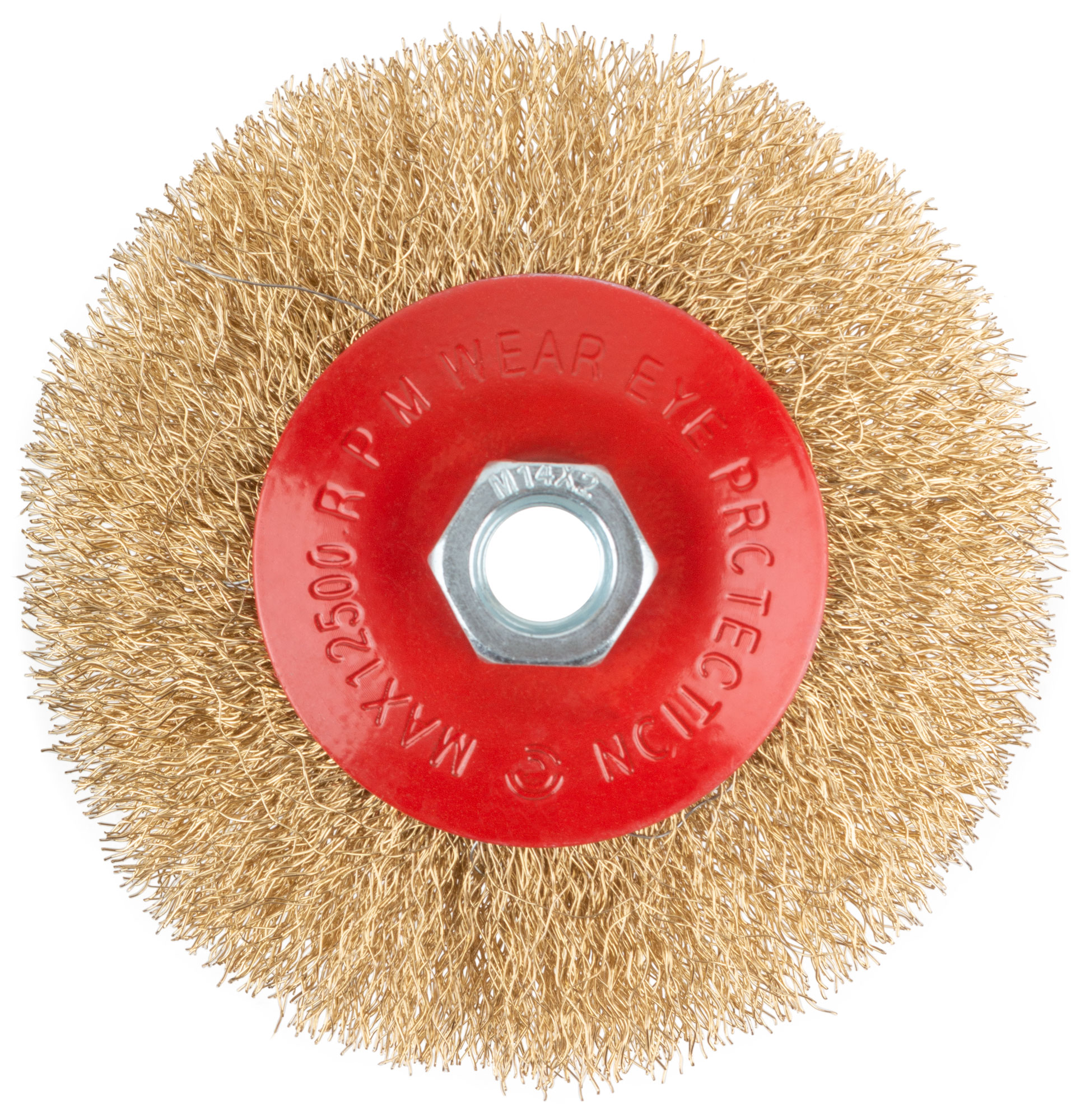 Корщетка-колесо с наклоном, гайка М14, стальная волнистая латунированная проволока 115 мм