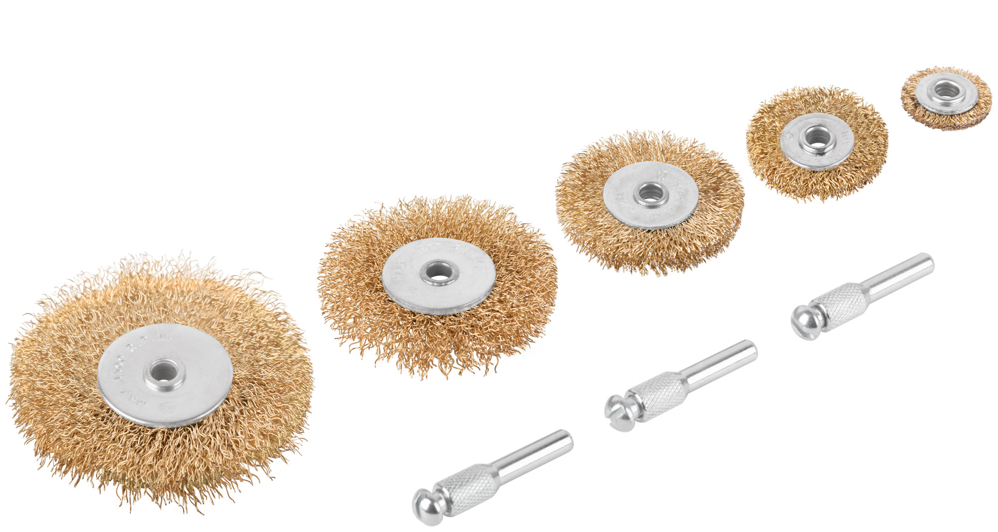 Набор 5 шт. (колеса 25 / 38 / 50 / 63 / 75 мм). Материал: стальная, латунированная, волнистая проволока. 3 стальных штифта для установки корщётки на дрель. Упаковка: блистер.