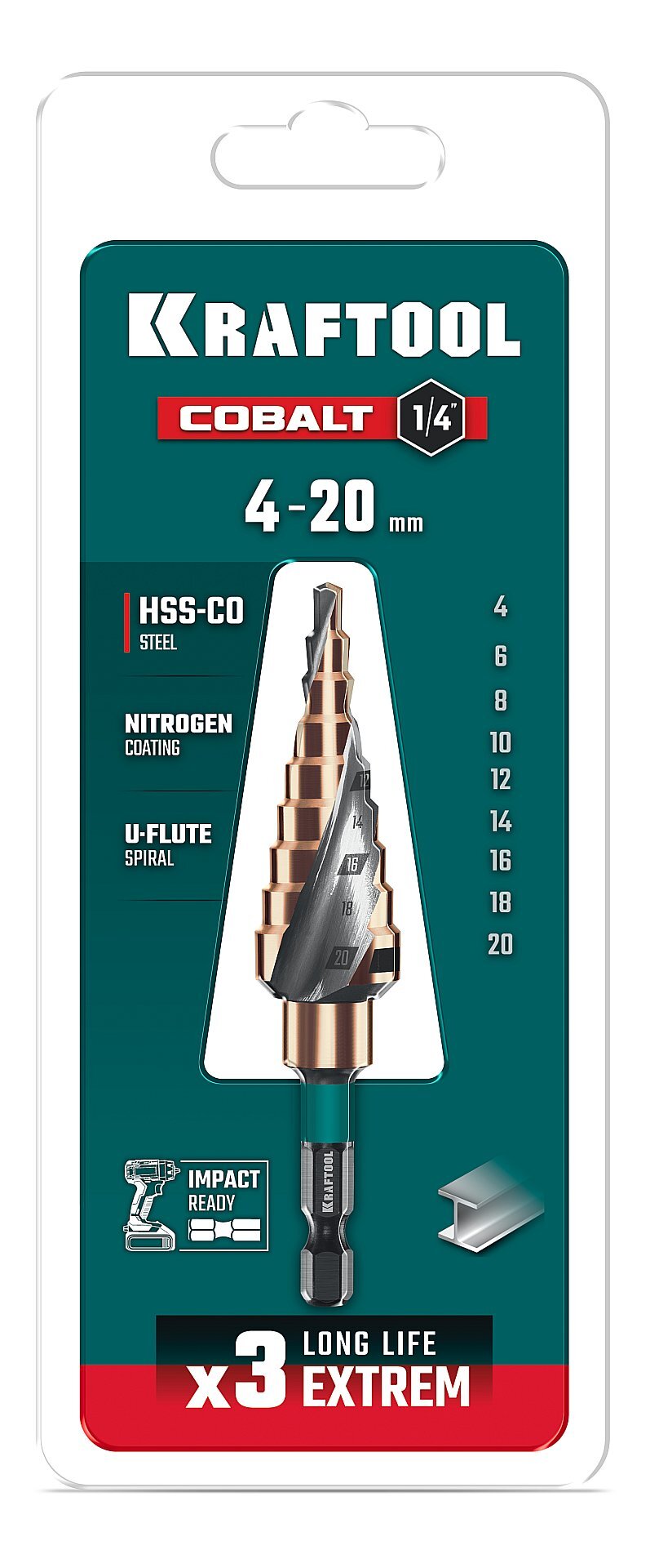 KRAFTOOL COBALT 4-20мм, 9 ступеней, азотирование, винтовая спираль, сверло ступенчатое(29691-4-20-9)