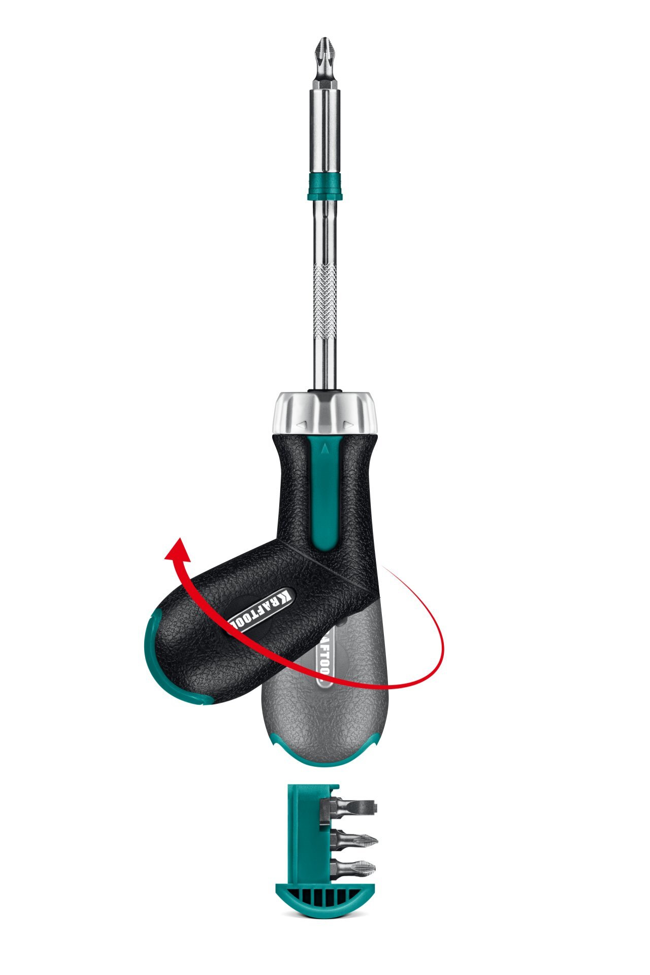 Реверсивная отвертка c прочным цельнометалическим трещоточным механизмом. Хранение бит внутри рукоятки дают возможность всегда иметь отвертку под рукой. Изменяемое положение рукоятки для увеличения момента затяжки.