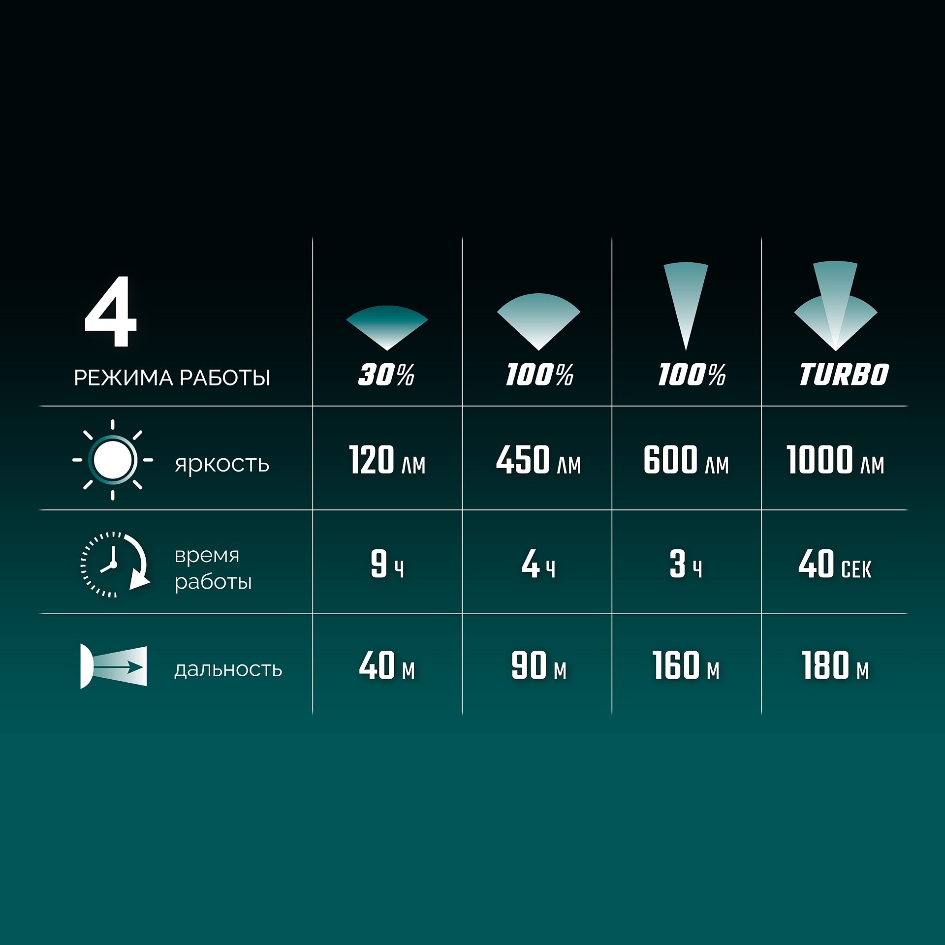 - Сверхмощный световой поток 1000 лм в режиме TURBO,