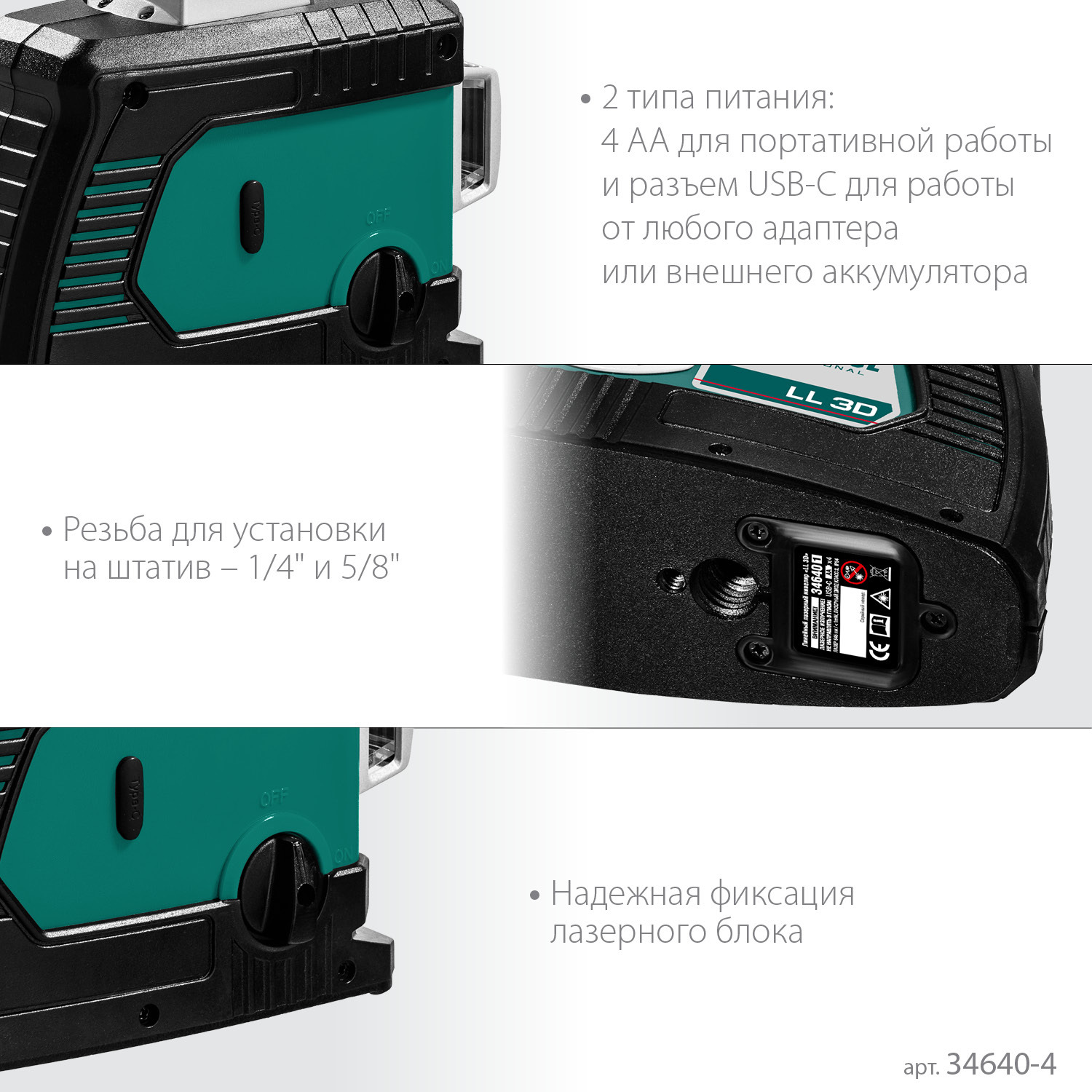 - 3 режима проецирования линий: горизонтальная и две вертикальные линии с развёрткой 360°, благодаря чему луч будет виден в любой точке.