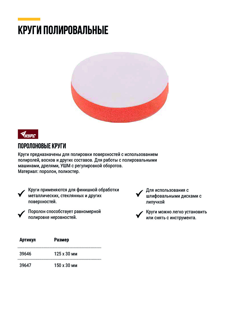 Поролоновый. Для полировки различных материалов с использованием полиролей, восков и других составов. С ворсовой основой под липучку. Для работы с полировальными машинами, дрелями, УШМ с регулировкой оборотов. Материал: поролон, полиэстер. Упаковка: п/э пакет с картонным подвесом.