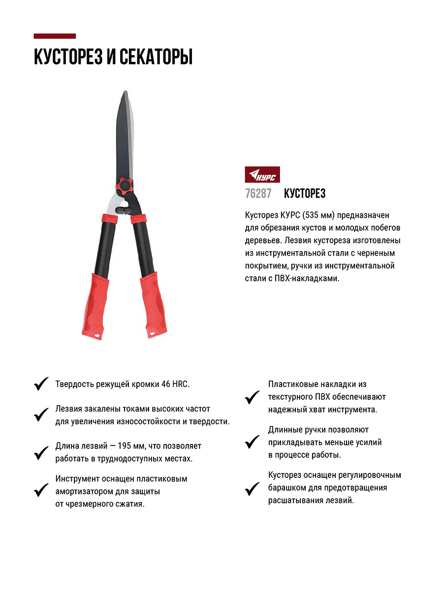 Лезвие 190 мм. Для обрезания кустов и молодых побегов деревьев. Твердость режущей кромки 46 HRC. Высокочастотная закалка лезвий. Материал: лезвия из инструментальной стали с черненым покрытием, ручки из инструментальной стали, ПВХ накладки на ручки.