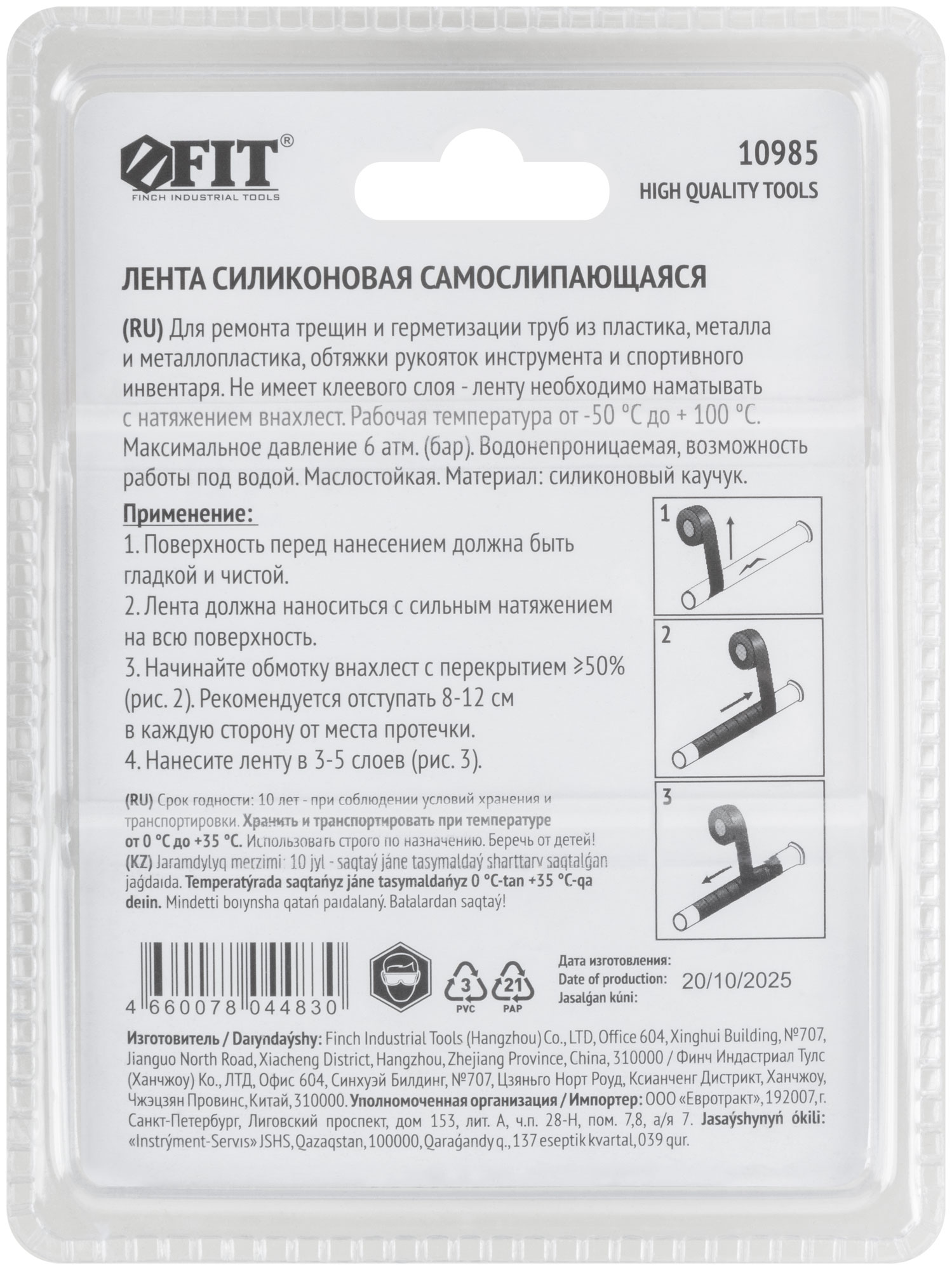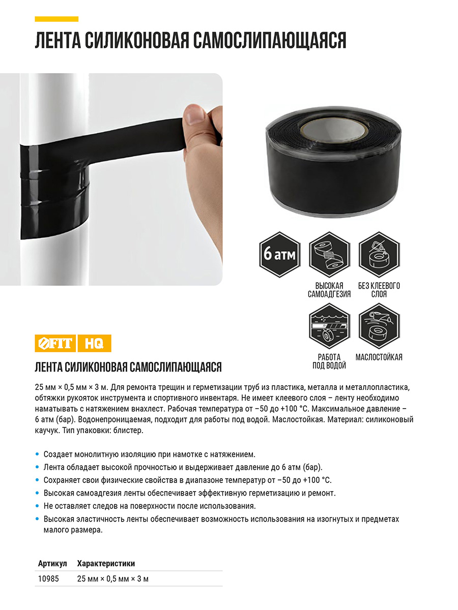 Для ремонта трещин и герметизации труб из пластика, металла и металлопластика, обтяжки рукояток инструмента и спортивного инвентаря. Не имеет клеевого слоя - ленту необходимо наматывать с натяжением внахлест. Рабочая температура от -50 °С до +100 °С. Максимальное давление6 атм. (бар). Водонепроницаемая, возможность работы под водой. Маслостойкая. Материал: силиконовый каучук. Упаковка: блистер.