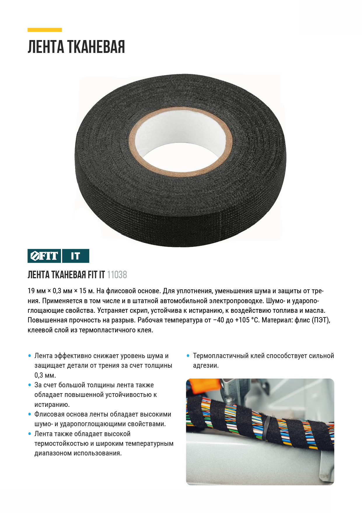 На флисовой основе. Для уплотнения, уменьшения шума и защиты от трения. Применяется в том числе в штатной автомобильной электропроводке. Шумо- и ударопоглащающие свойства. Устраняет скрип, устойчива к истиранию, к воздействию топлива и масла. Повышенная прочность на разрыв. Рабочая температура от -40 °С до +105 °С. Материал: флис (ПЭТ), клеевой слой из термопластичного клея.