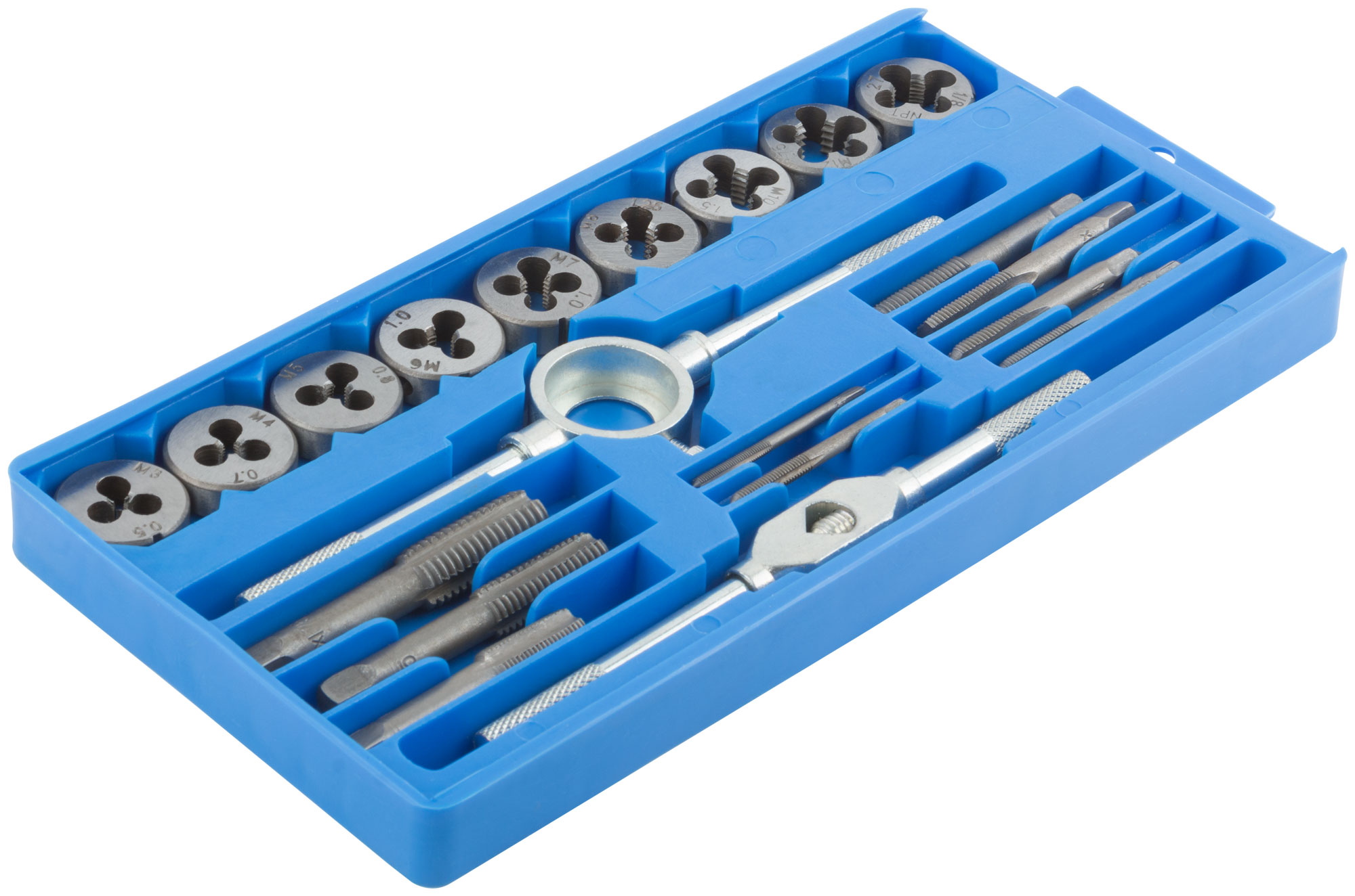 Для труб из цветных металлов при мелком бытовом ремонте. В наборе:метчикодержатель, плашкодержатель, 9 метчиков и 9 плашек. Материал: инструментальная сталь. Упаковка: пластиковая коробка.