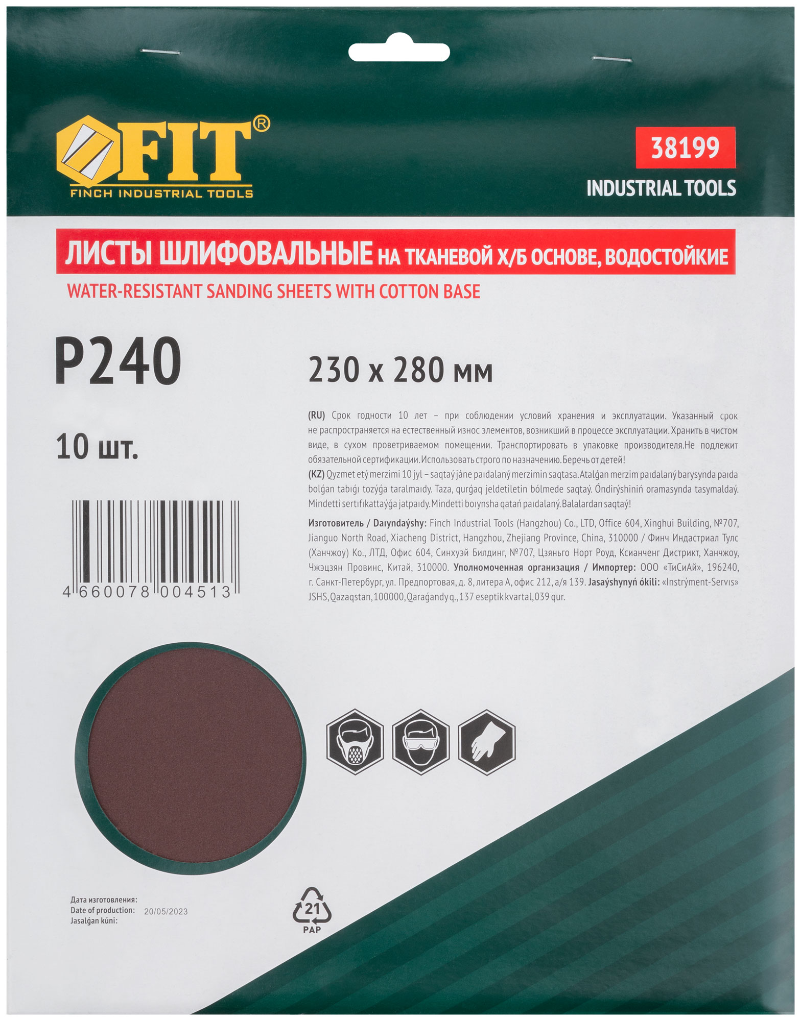 Листы шлифовальные водостойкие на тканевой основе, алюминий-оксидные, Профи 230х280 мм, 10 шт. Р 240