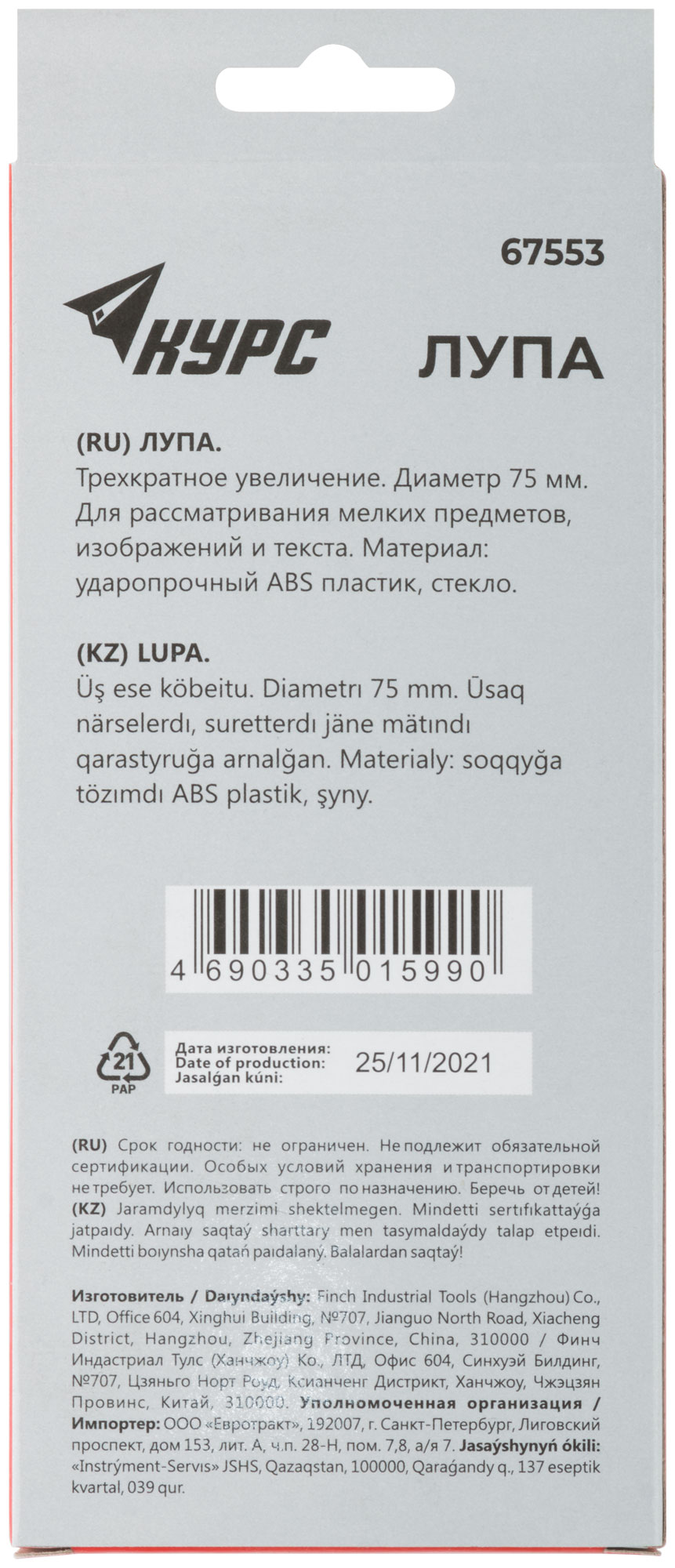 Лупа, пластиковый корпус, ручка ABS пластик. Упаковка: картонная коробка.