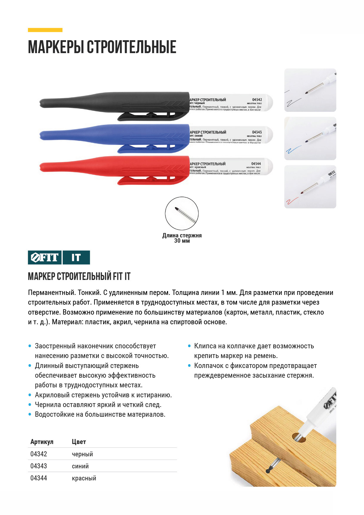 Перманентный. Тонкий, с удлиненным пером. Толщина линии 1 мм. Для разметки при проведении строительных работ. Применяется в труднодоступных местах, в том числе для разметки через отверстие. Возможно применение по большинству материалов (картон, металл, пластик, стекло и т.д.) Материал: пластик, акрил, чернила на спиртовой основе.