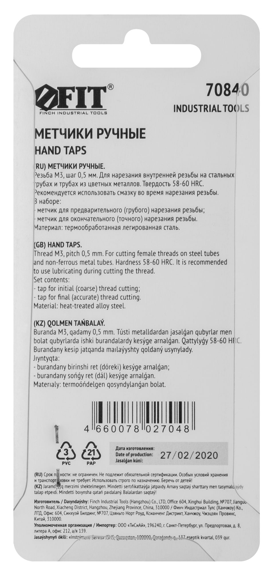 Набор 2 шт. (грубая и точная резьба). Для нарезания внутренней резьбы на изделиях из стали и цветных металлов. Закалка до HRC 58-60. Материал: легированная сталь. Упаковка: блистер.