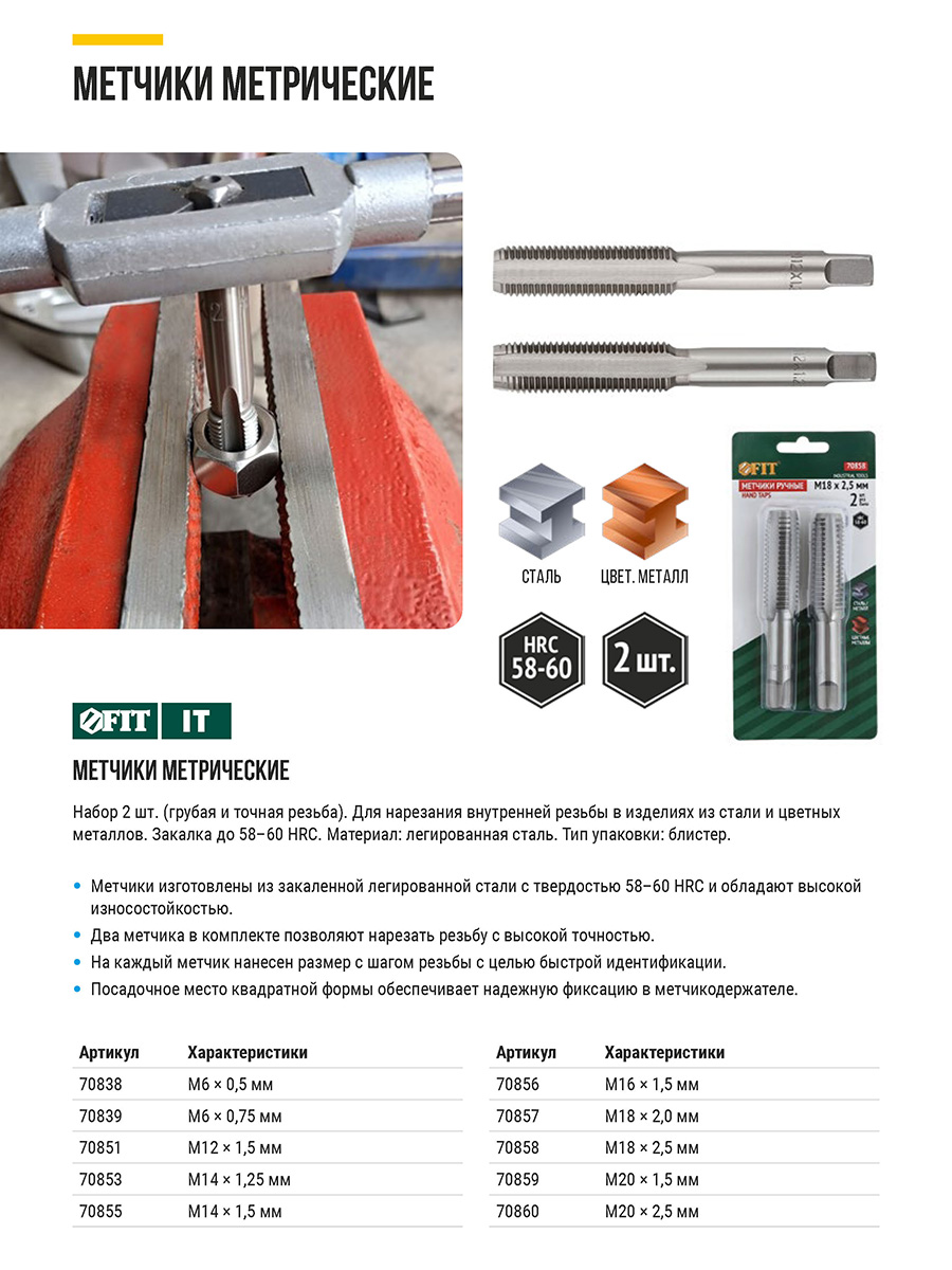 Набор 2 шт. (грубая и точная резьба). Для нарезания внутренней резьбы на изделиях из стали и цветных металлов. Закалка до HRC 58-60. Материал: легированная сталь. Упаковка: блистер.