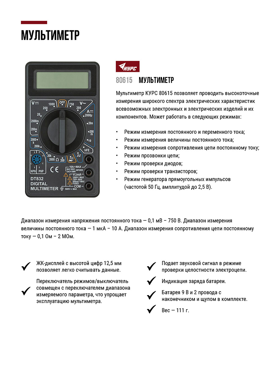 Подает звуковой сигнал в режиме проверки целостности электроцепи. Индикация разряда батареи. Батарея 9 В и 2 провода с наконечником и щупом в комплекте. Диапазон измерения напряжения постоянного тока - 0,1 мВ - 1000 В. Диапазон измерения напряжения переменного тока - 0,1 В - 750 В. Диапазон измерения величины постоянного тока - 1 мкА - 10 А. Диапазон измерения сопротивления цепи постоянному току - 0,1 Ом - 2 МОм.