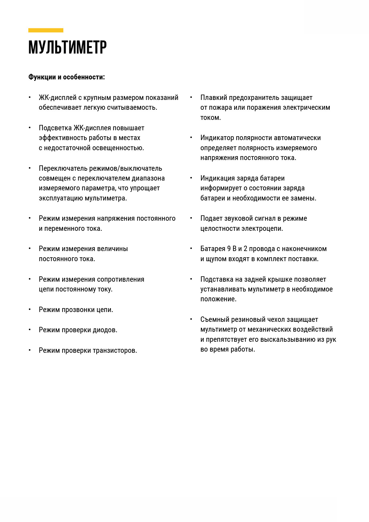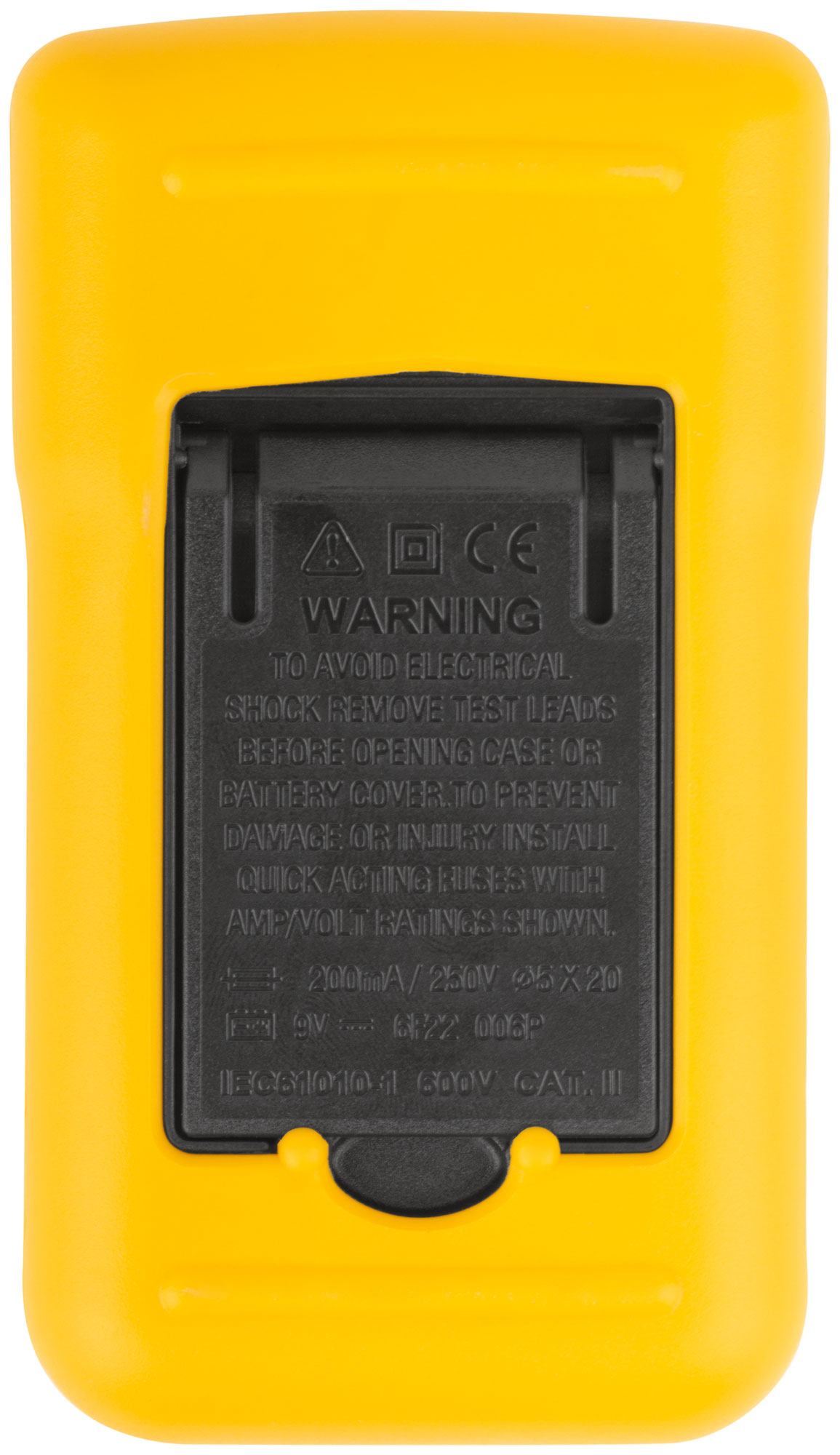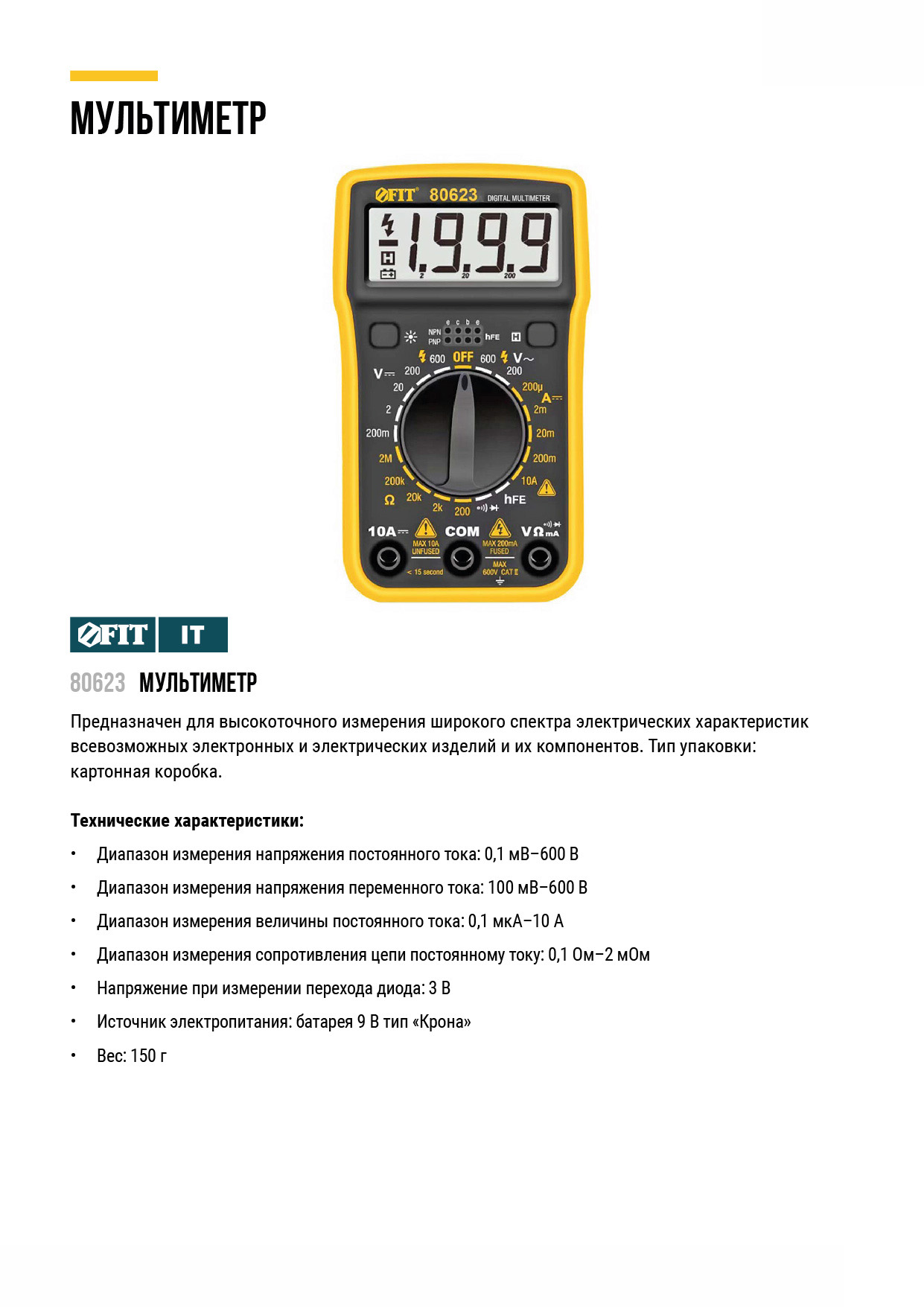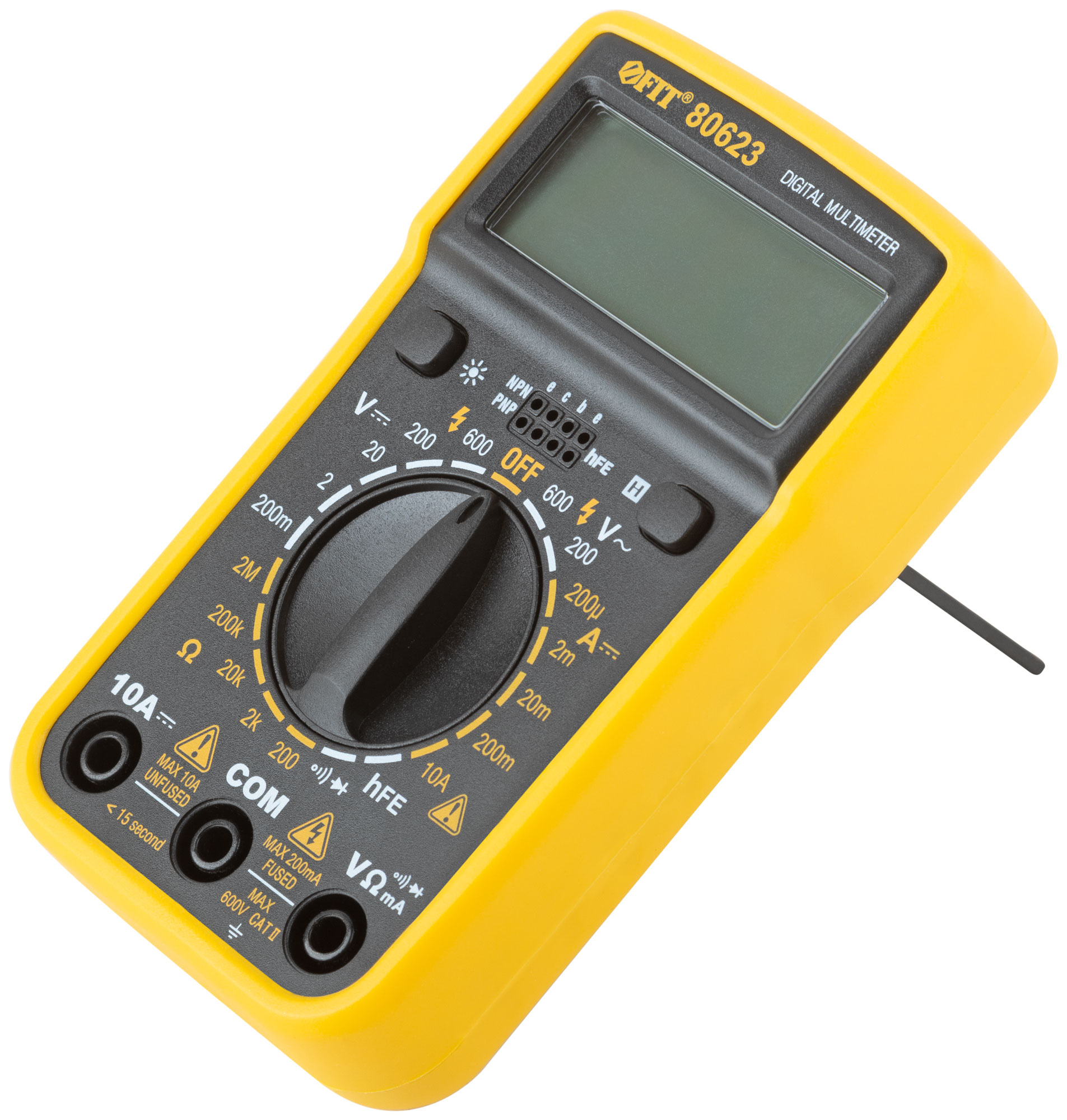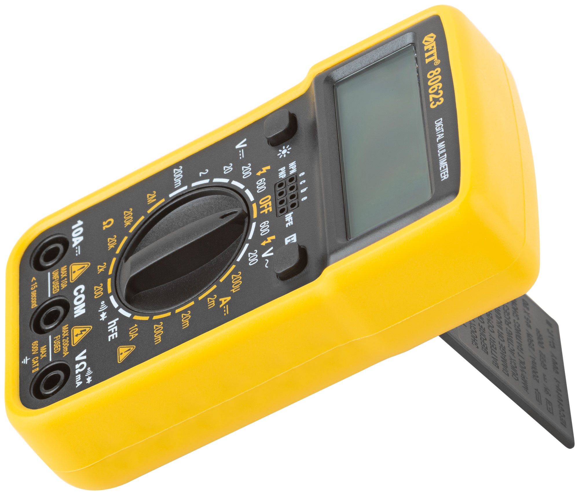 Подает звуковой сигнал в режиме целостности электроцепи. Индикация разряда батареи. Батарея 9 В и провод с наконечником и щупом в комплекте. Мягкий протектор с подставкой для защиты мультиметра и удобства использования. Диапазон измерения напряжения постоянного тока 0,1 мВ - 600 В. Диапазон измерения напряжения переменного тока 100 мВ - 600 В. Диапазон измерения величины постоянного тока 0,1 мкА - 10 А. Диапазон измерения сопротивления цепи постоянному току 0,1 Ом - 2 МOм.