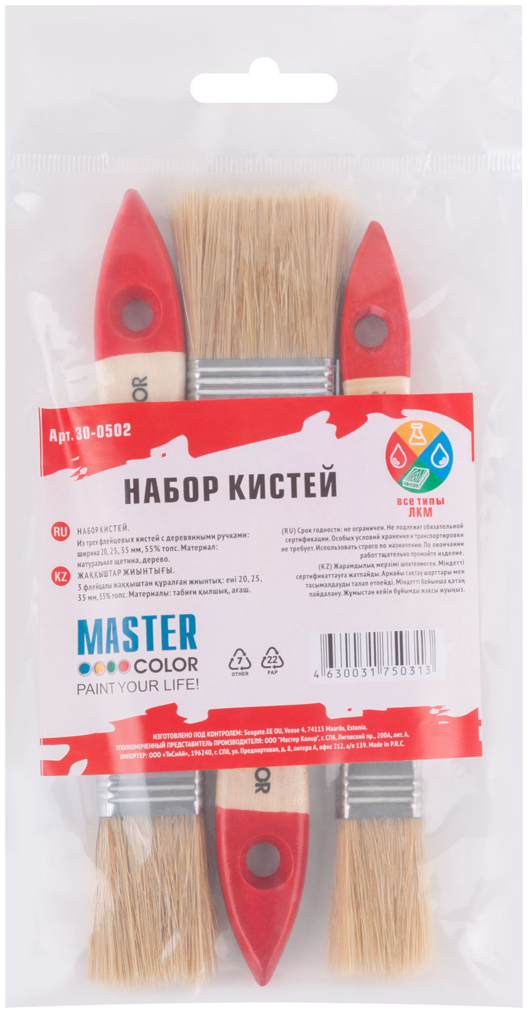 Светлая натуральная щетина. 55% топс. Деревянная обработанная ручка. Флейцевые кисти, ширина 20 мм, 25 мм, 35 мм.