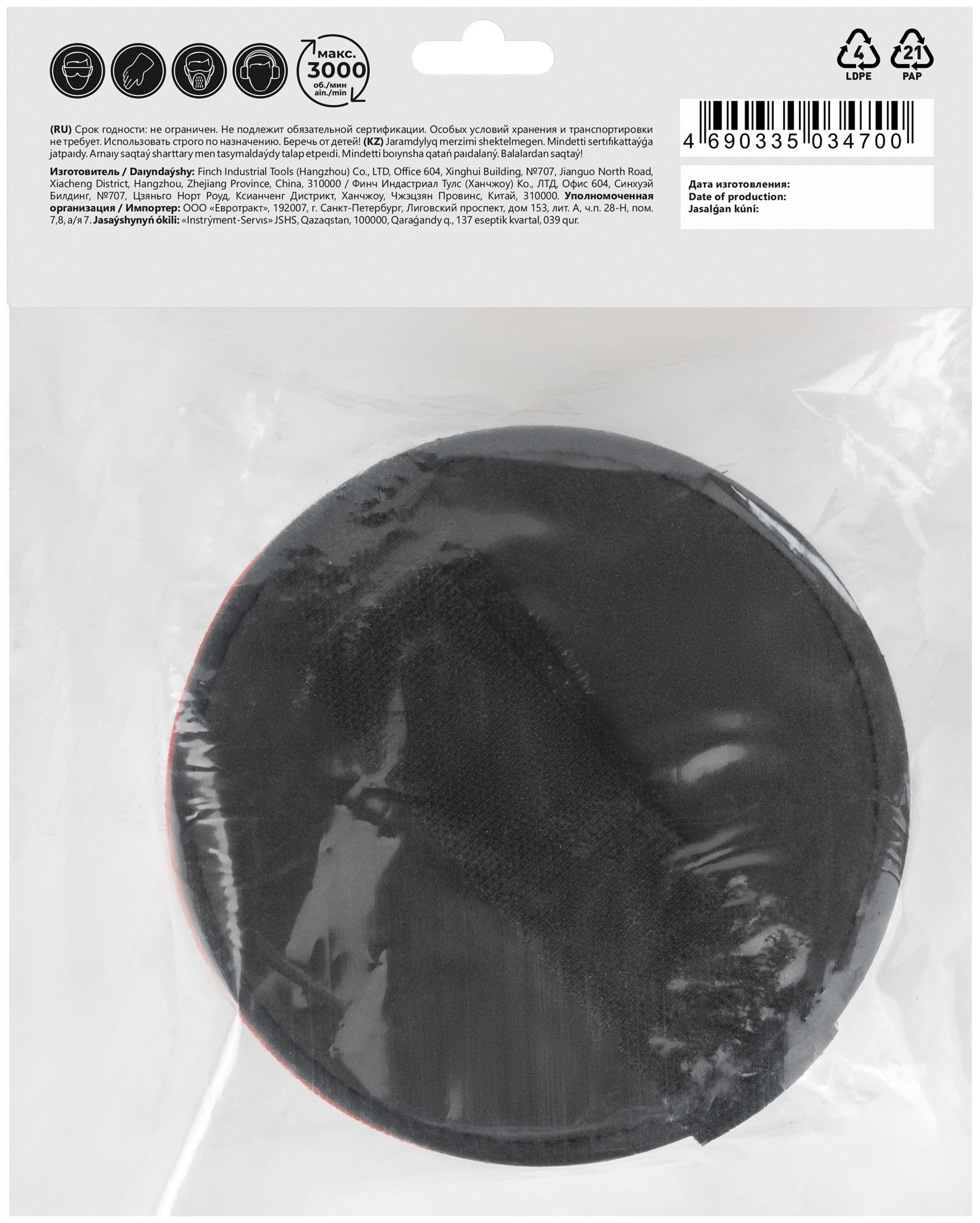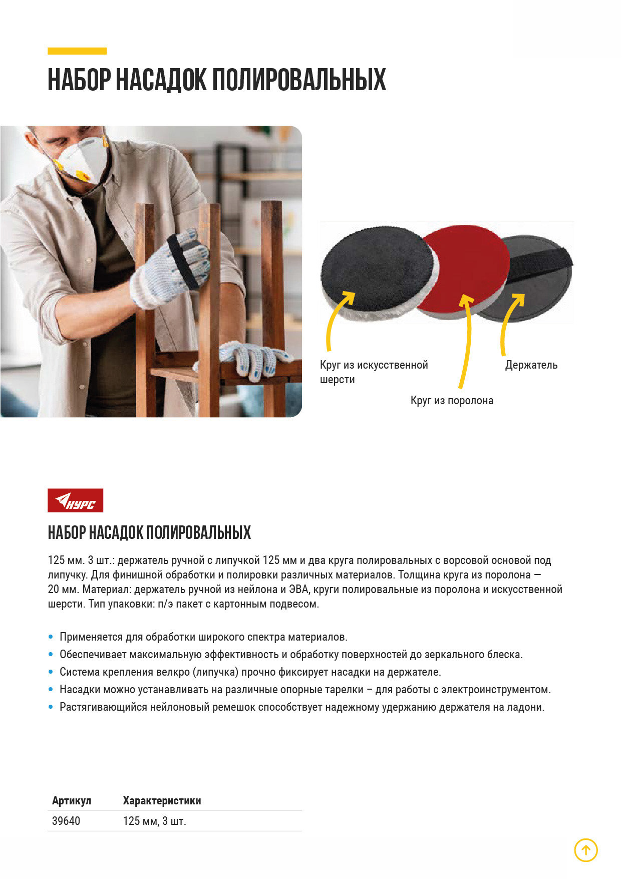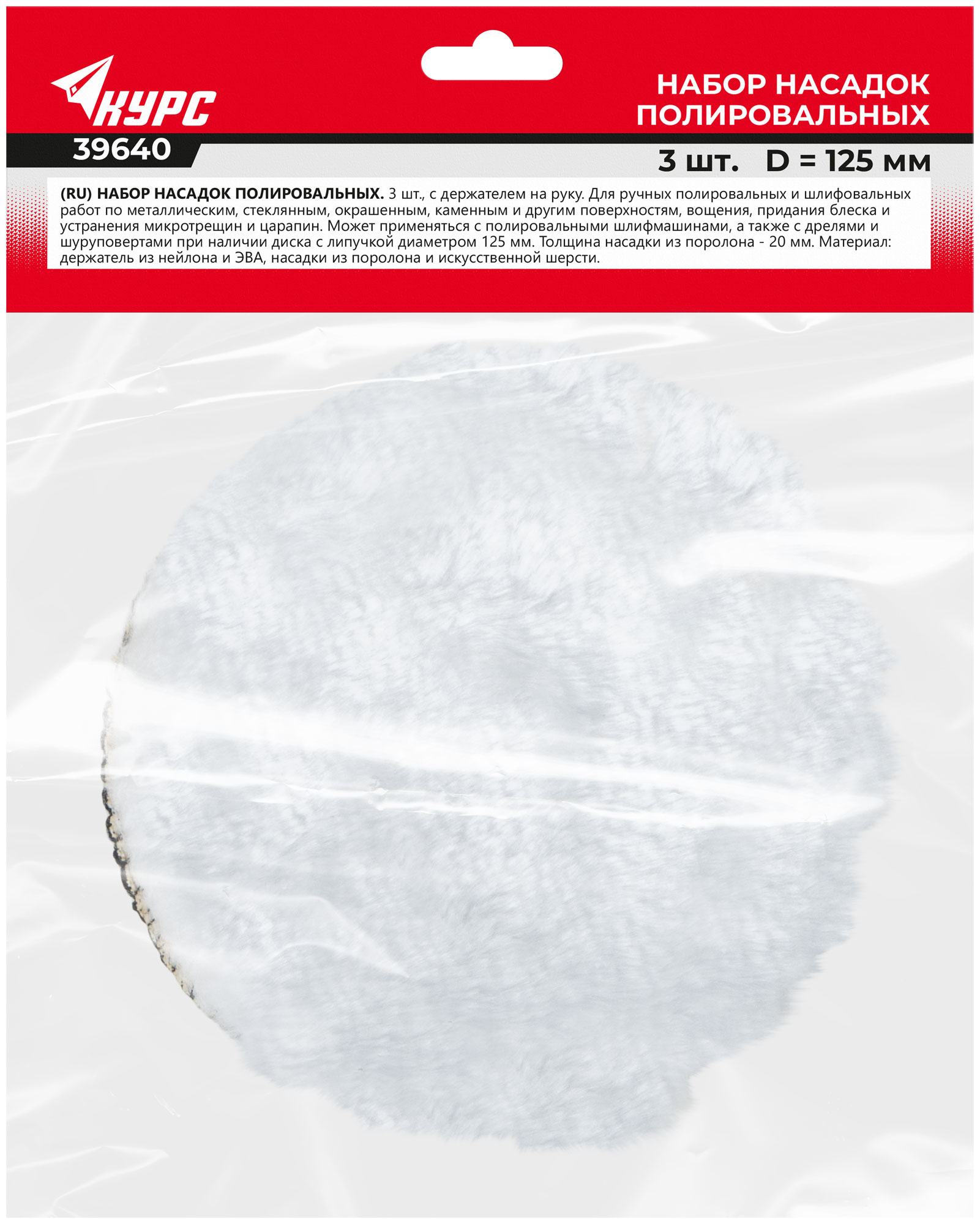 3 шт.: держатель ручной с липучкой 125 мм и два круга полировальных с ворсовой основой под липучку. Для финишной обработки и полировки различных материалов. Толщина круга из поролона - 20 мм. Материал: держатель ручной из нейлона и ЭВА, круги полировальные из поролона и искусственной шерсти. Упаковка: п/э пакет с картонным подвесом.