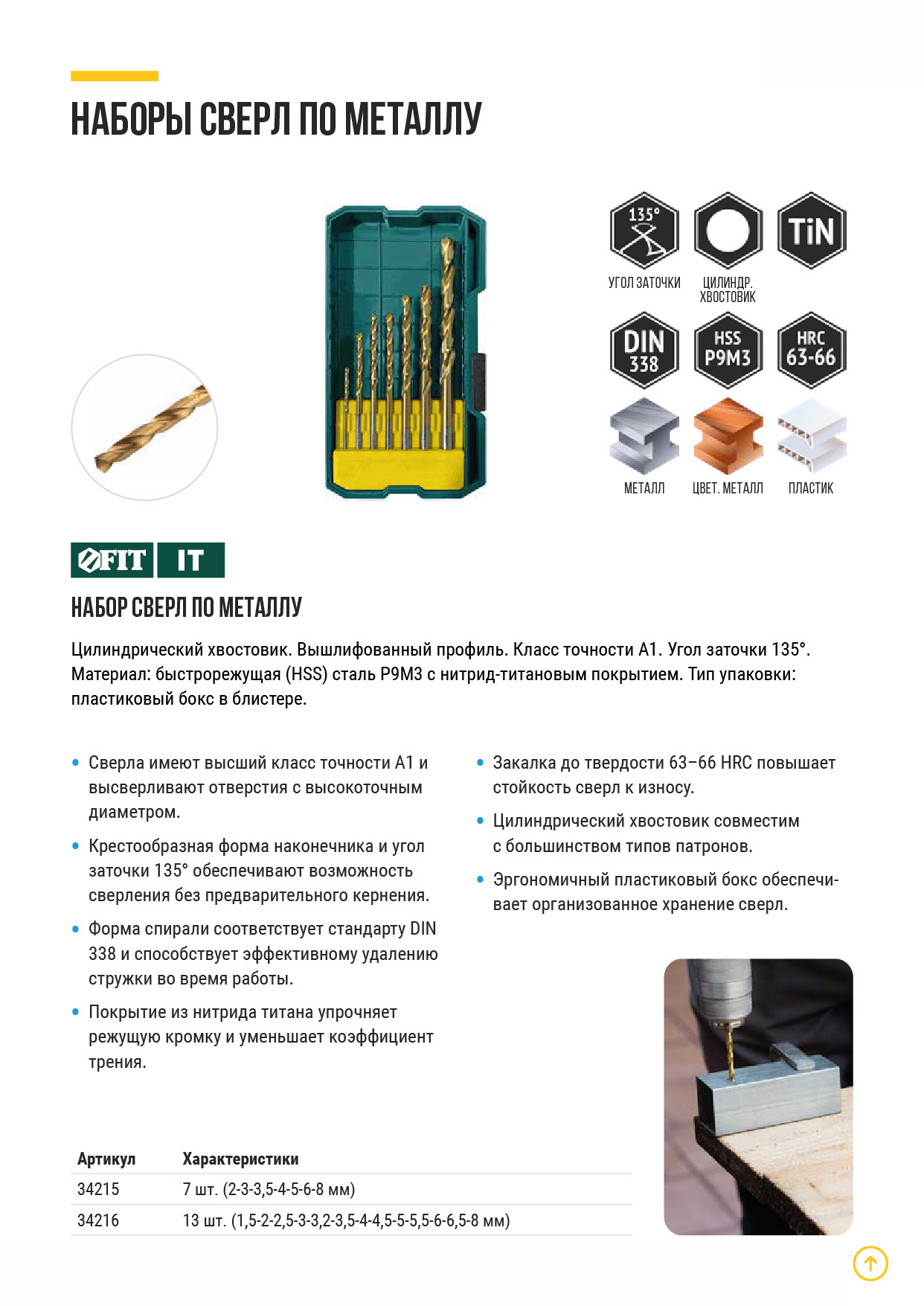 Цилиндрический хвостовик. Вышлифованный профиль. Угол заточки 135°. Класс точности А1. Материал: термообработанная быстрорежущая (HSS) сталь Р9М3. Упаковка: пластиковый бокс в блистере.