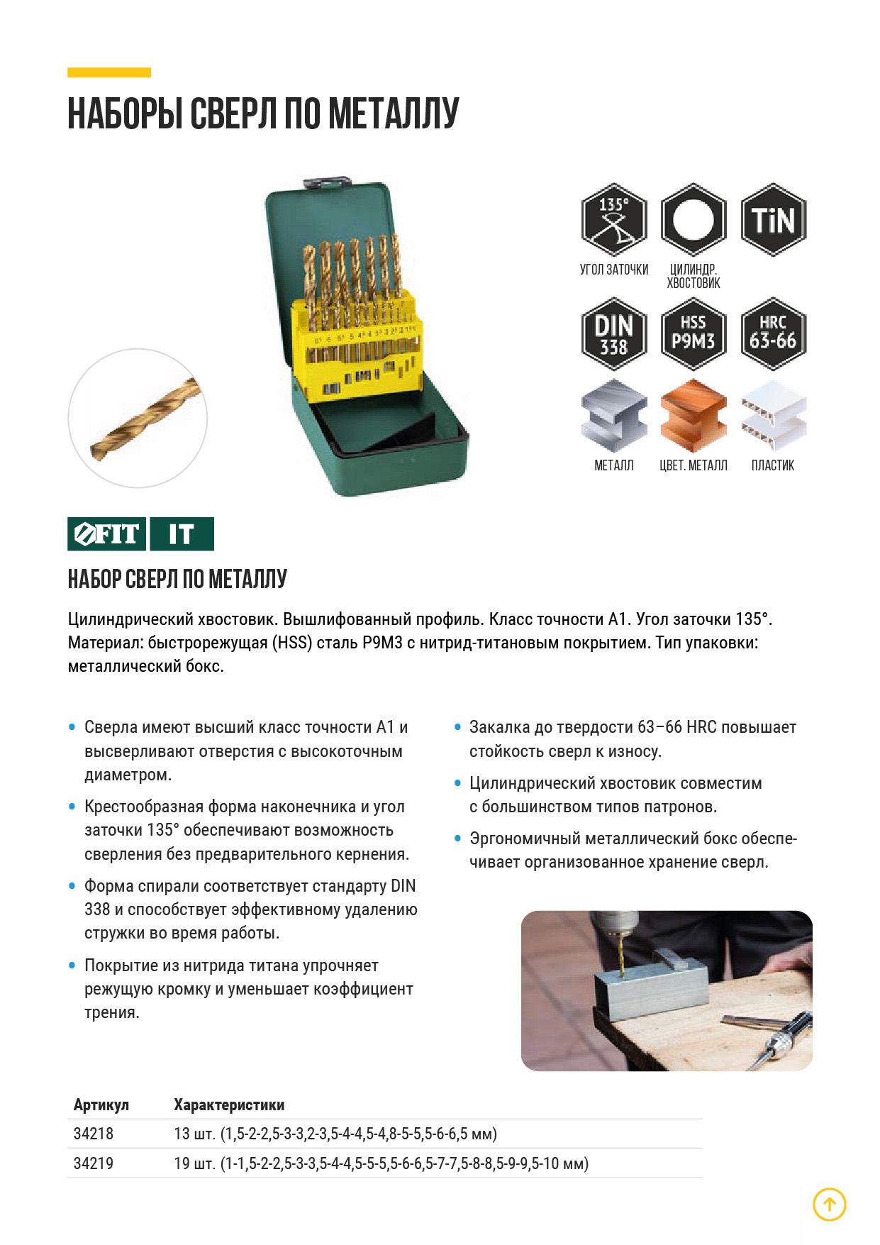 Цилиндрический хвостовик. Вышлифованный профиль. Угол заточки 135°. Класс точности А1. Материал: термообработанная быстрорежущая (HSS) сталь Р9М3. Упаковка: металлический бокс.
