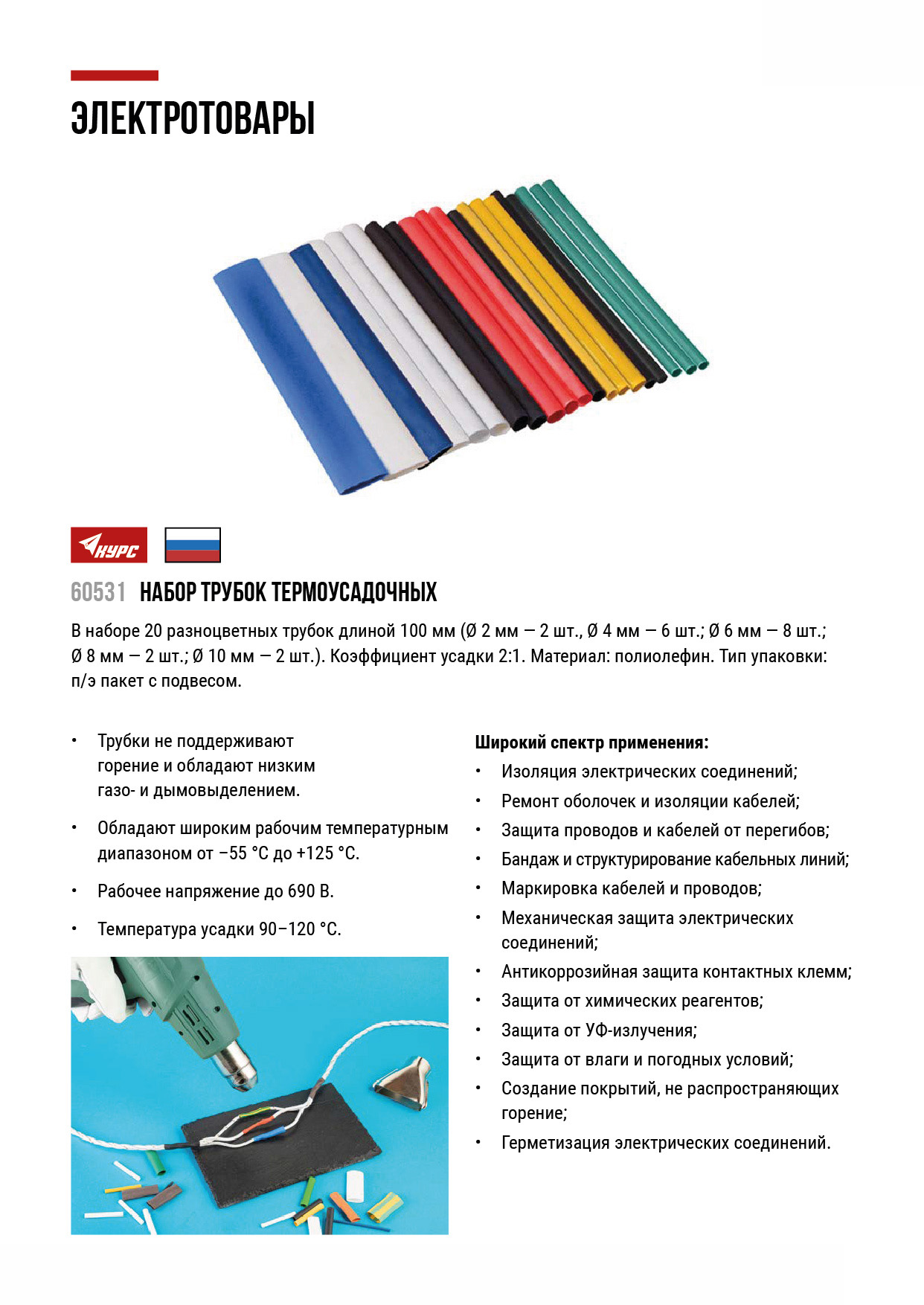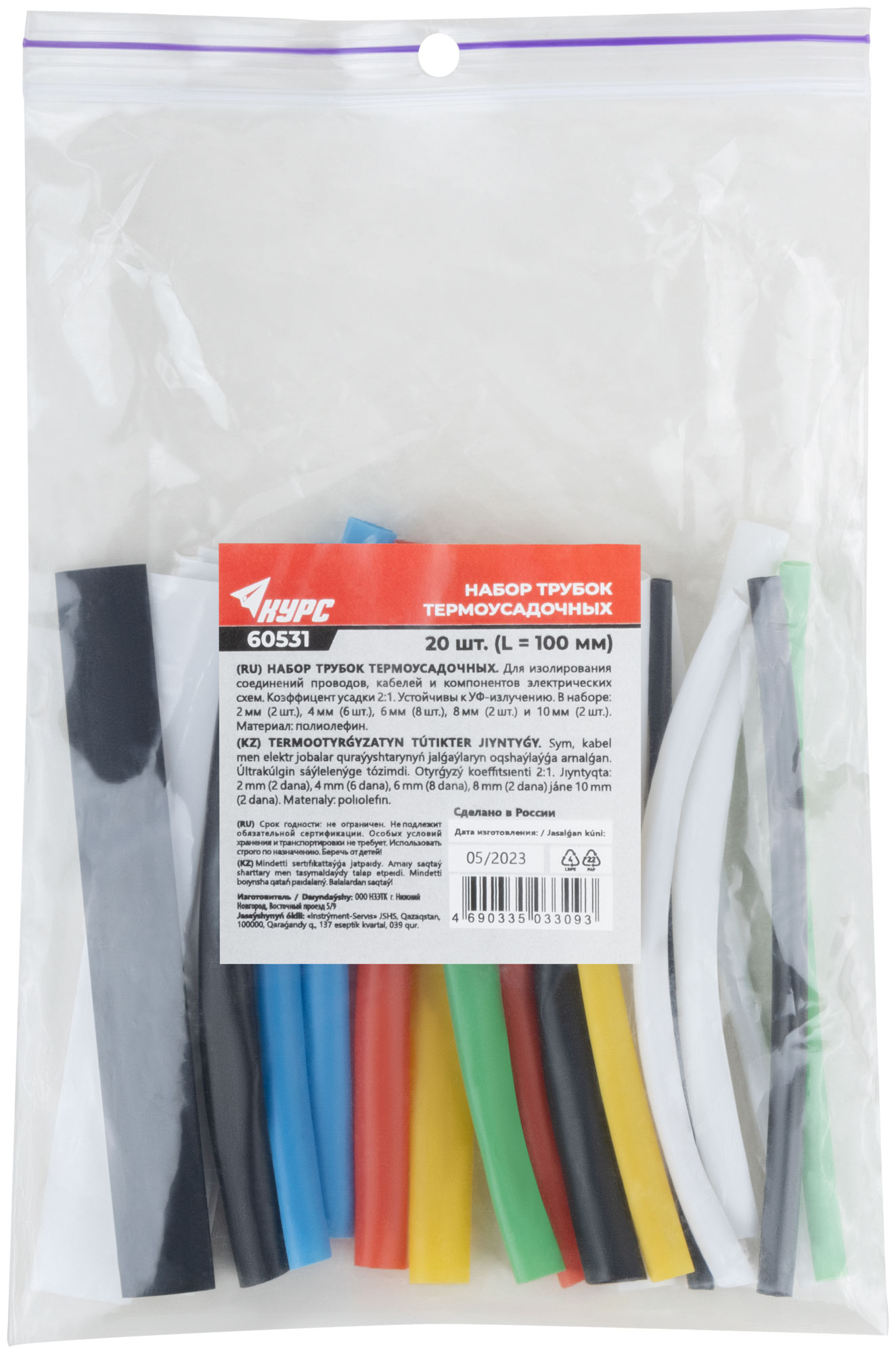 Для изолирования соединений проводов, кабелей и компонентов электрических схем. Устойчивы к УФ-излучению. В наборе 20 разноцветных трубок длиной 100 мм (2 мм - 2 шт., 4 мм - 6 шт.; 6 мм - 8 шт.; 8 мм - 2 шт.; 10 мм -2 шт. ). Коэффицент усадки 2:1. Материал: полиолефин. Упаковка: п/э пакет с подвесом.