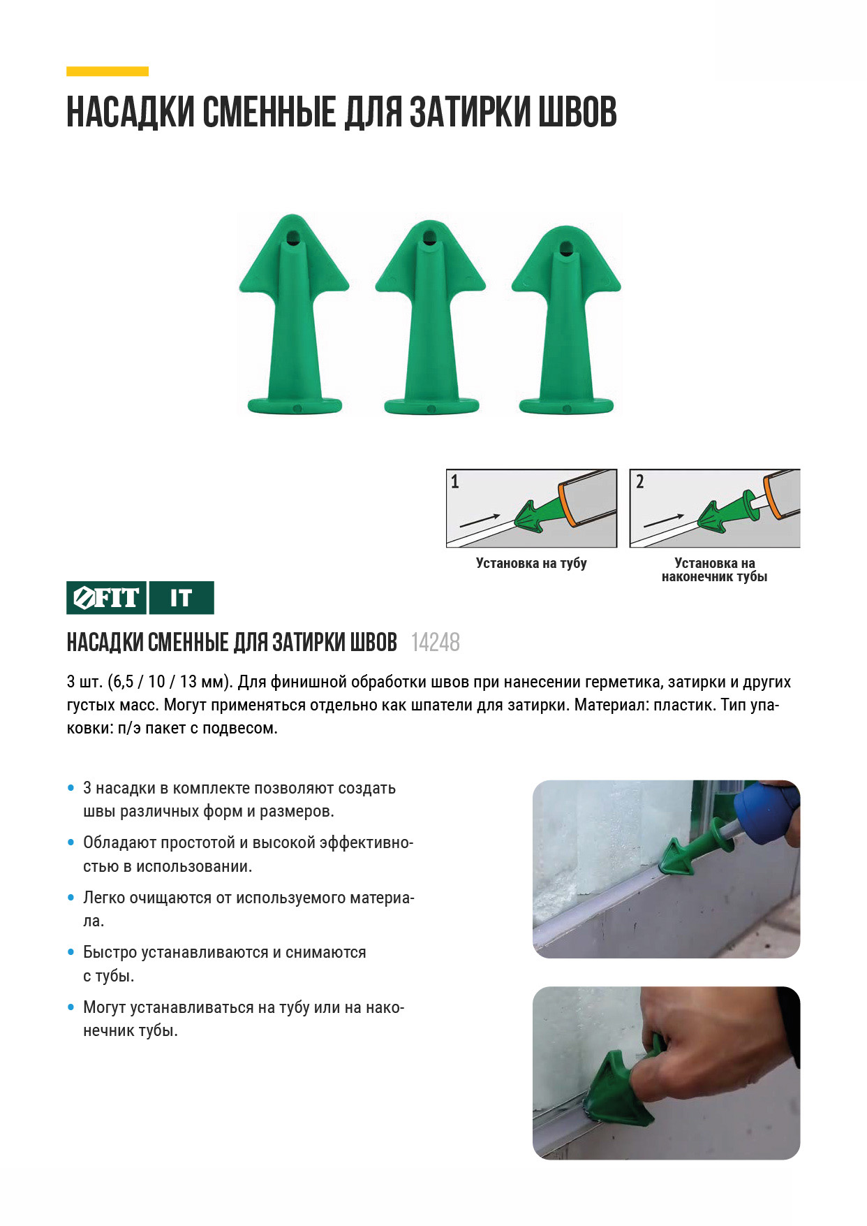 Для финишной обработки швов при нанесении герметика, затирки и других густых масс. Также отдельно применяются как шпатель для затирки. Материал: пластик. Упаковка: П/Э пакет с картонным подвесом.