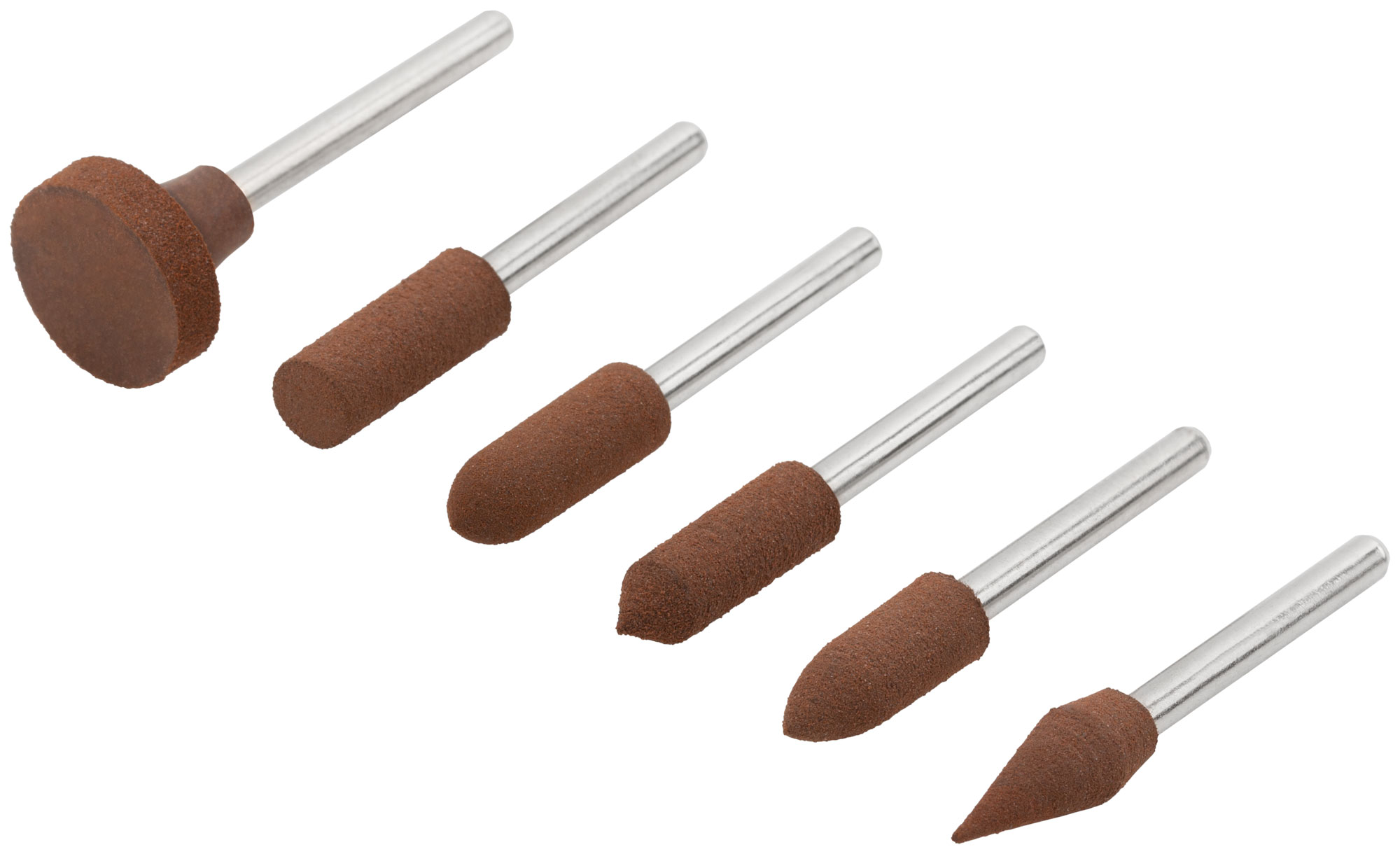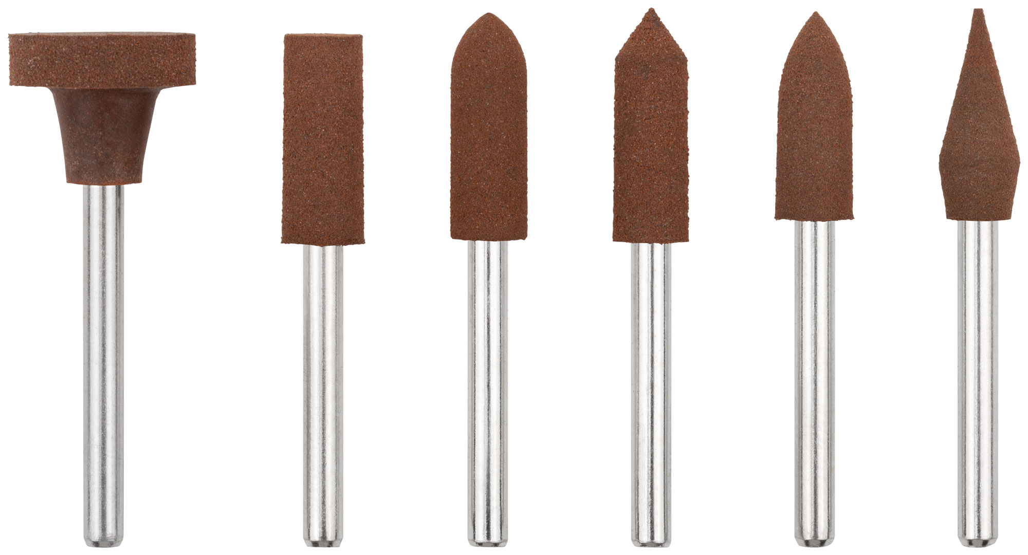 Для гравировальной машины. В наборе 6 шт. Предназначены для шлифовки и полировки изделий из стали и цветных металлов. Зернистость: P150. D хвостовика=3,1 мм. Материал: резина, хвостовик из инструментальной стали, корунд. Упаковка: блистер.