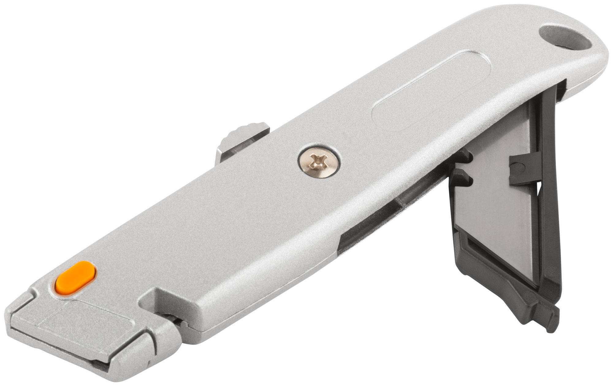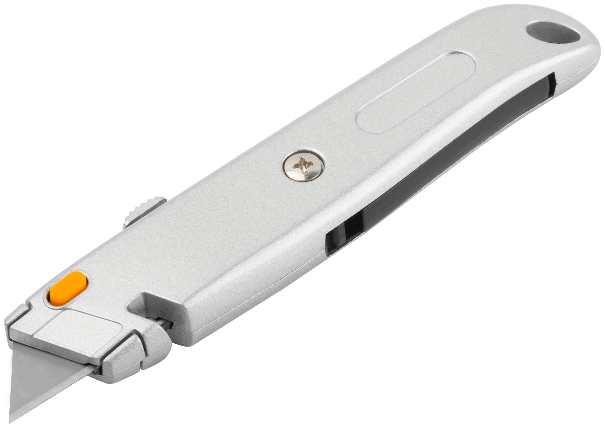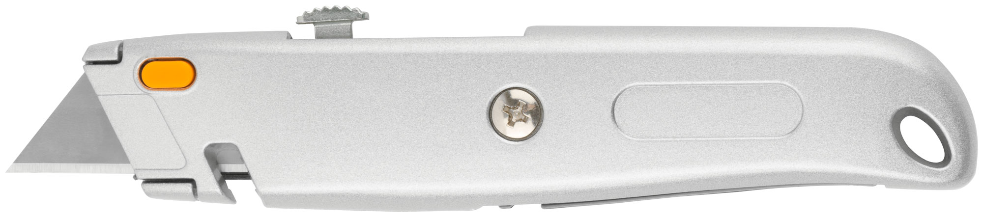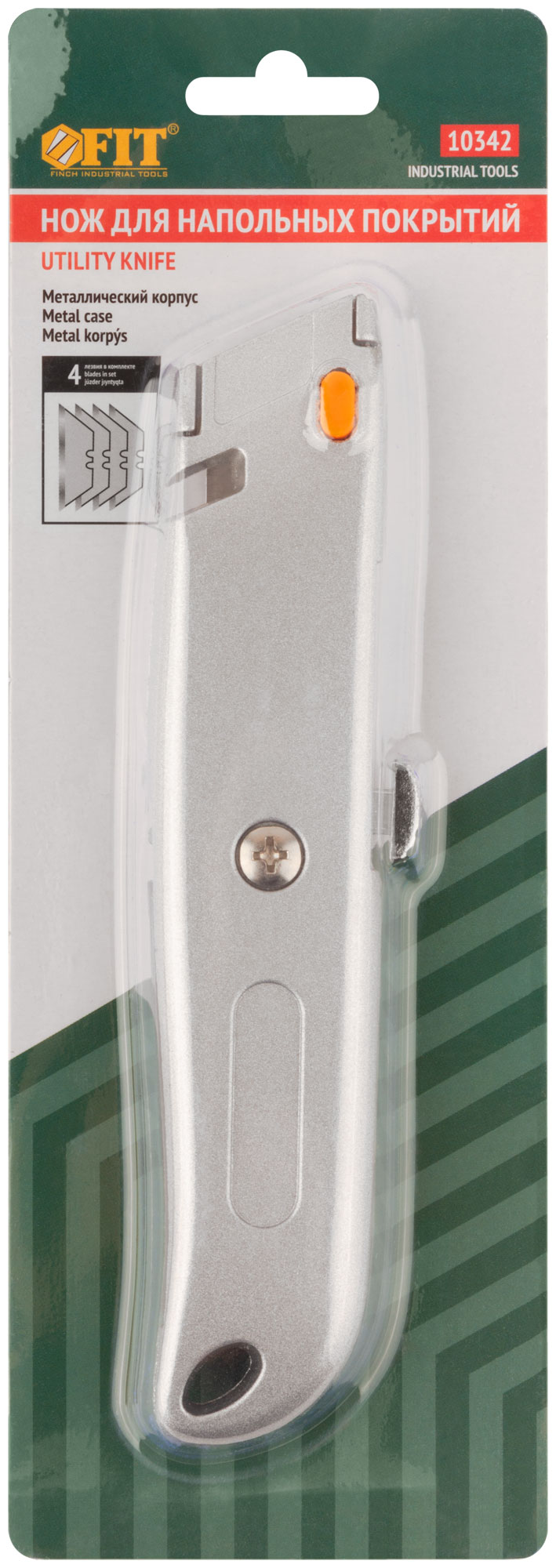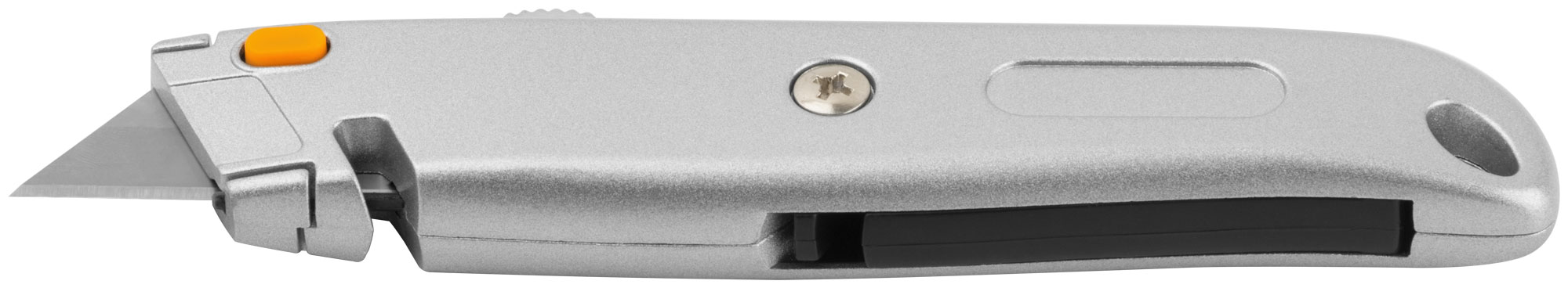 Для резки напольных покрытий. С отсеком для хранения лезвий. 4 лезвия в комплекте. Выемка в корпусе позволяет резать веревки, шнуры и т. д., не выдвигая лезвие. Материал: лезвие из высокоуглеродистой стали, корпус из алюминиевого сплава. Упаковка: блистер.