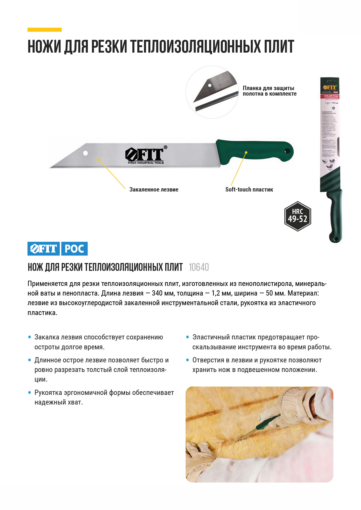 Применяется для резки теплоизоляционных плит, изготовленных из различных материалов (пенополистирола, минеральной ваты, пенопласта и т.д.). Длинноеостро заточенное лезвие позволяет быстро и ровноразрезать толстый слой теплоизоляции без появлениярваных краёв и образования «крошки» утеплителя.Толщина лезвия 1,2 мм, ширина 50 мм. Материал: лезвие из высокоуглеродистой закаленной инструментальной стали, ручка из эластичного пластика