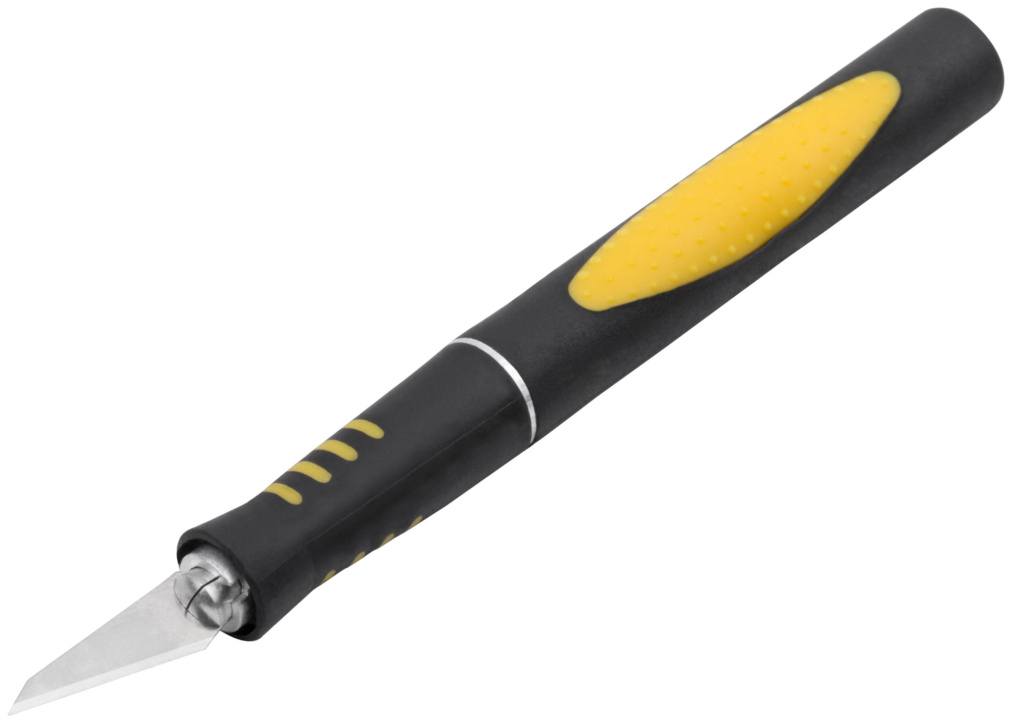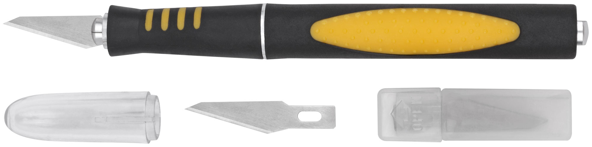5 запасных лезвий в комплекте. Для резки бумаги, ткани, пластика, кожи, мягких пород древесины (например сосна) и других художественных работ. Материал: прорезиненный алюминиевый корпус, пластиковая крышка и вставки, лезвие из инструментальной стали. Упаковка: блистер.