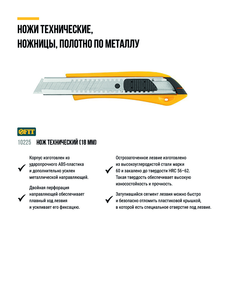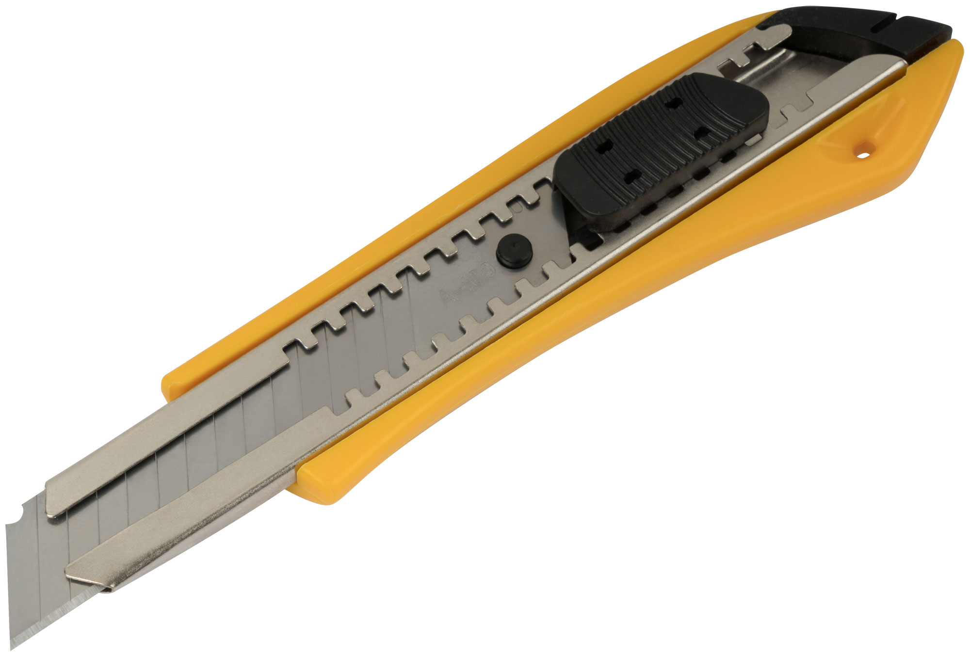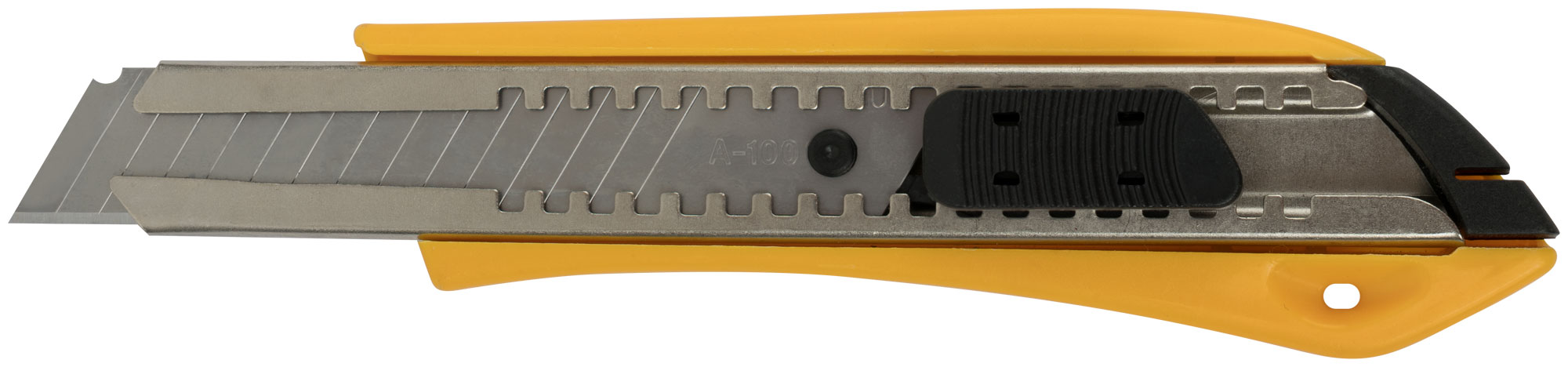 «Отламывающееся» лезвие с пластиковым прижимом, 15 сегментов. Металлическая направляющая с двусторонней автофиксацией для усиления конструкции. Материал: ударопрочный ABS пластиковый корпус, лезвие из высокоуглеродистой стали.Упаковка: п/э пакет с картонным подвесом.