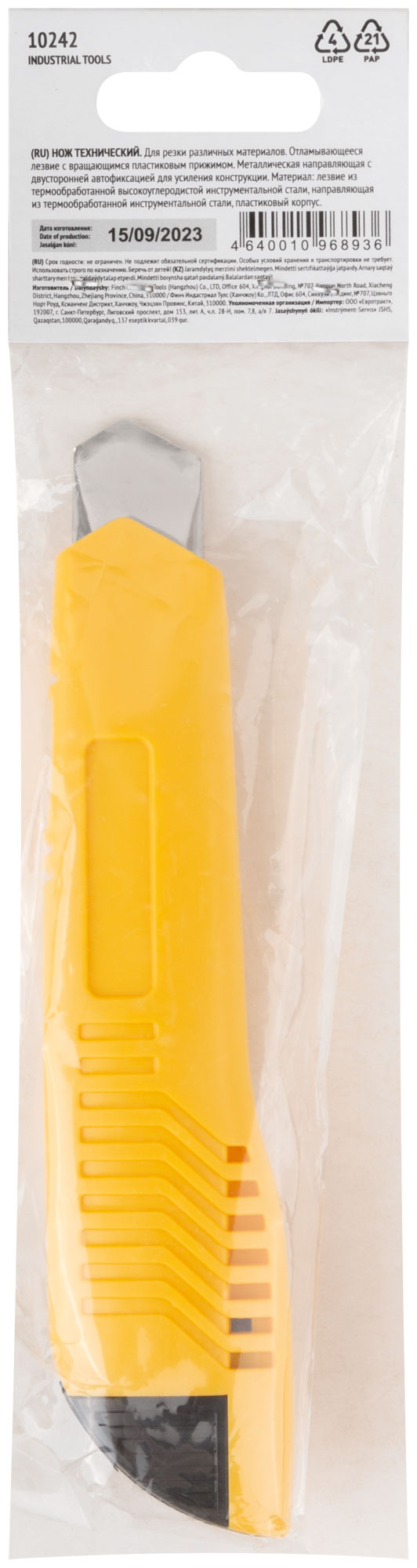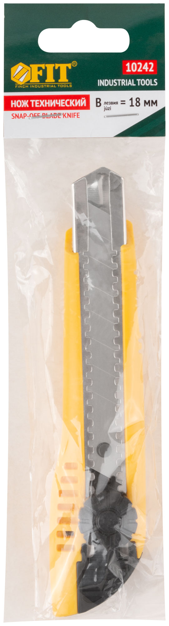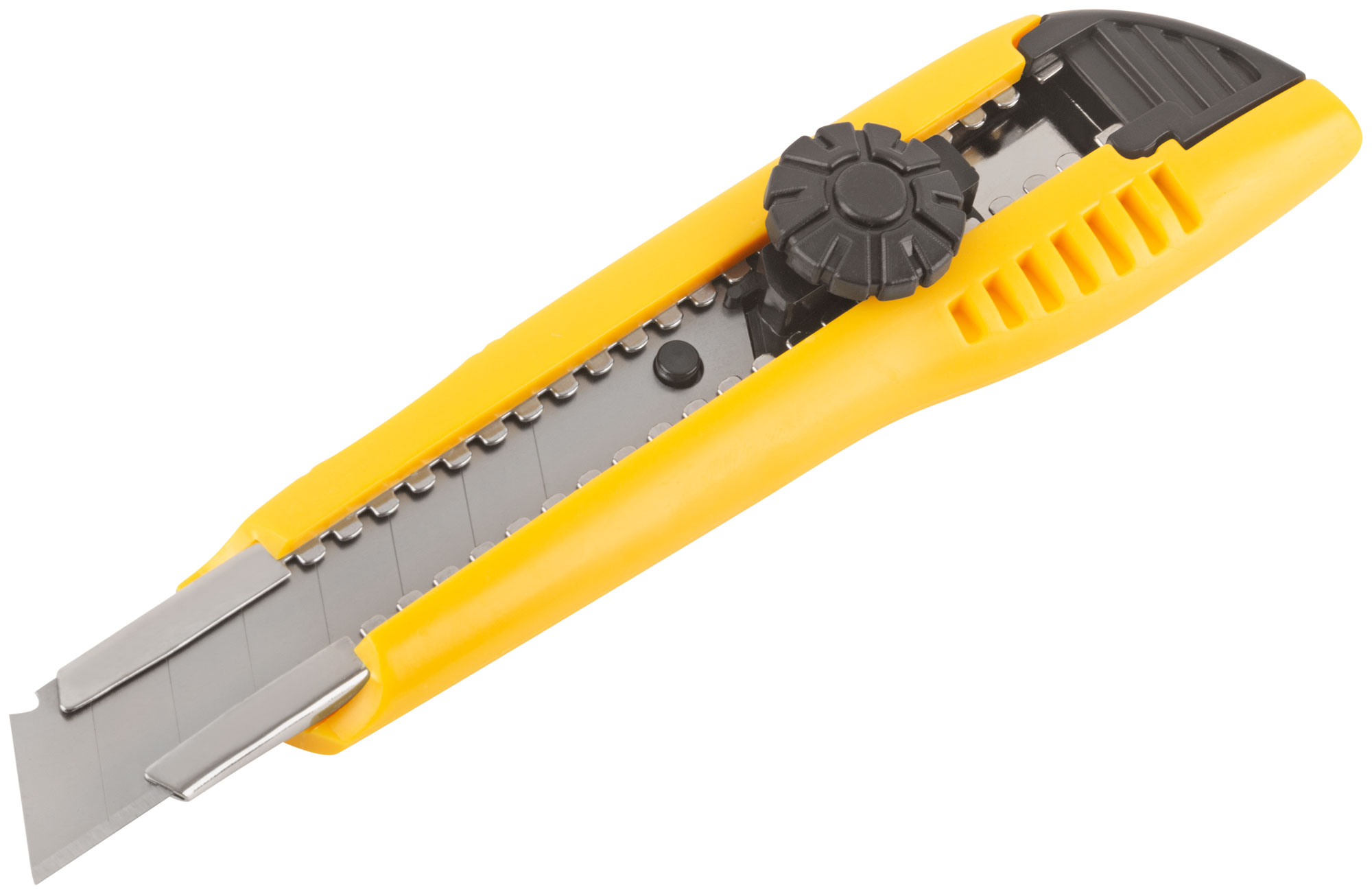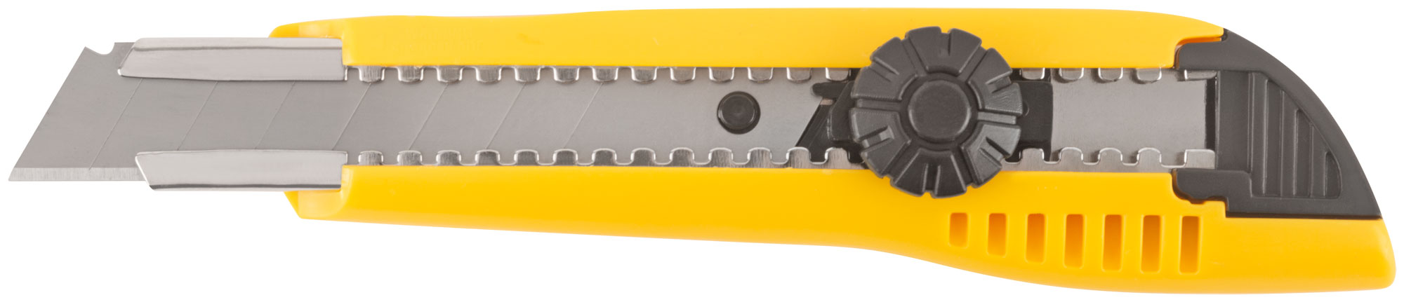«Отламывающиеся лезвие», с вращающимся пластиковым прижимом из высокоуглеродистой стали. Материал: пластиковый корпус, усиленный металлической направляющей, лезвие из инструментальной стали. Упаковка: п/э пакет с картонным подвесом.