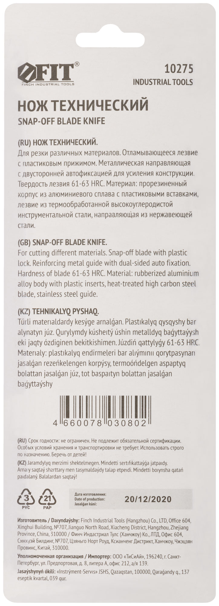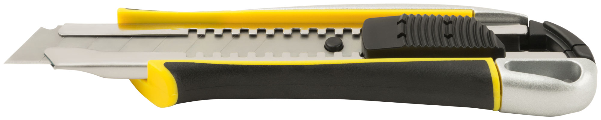 «Отламывающееся» лезвие с пластиковым прижимом. Металлическая направляющая для усиления конструкции. Материал: прорезиненный корпус из алюминиевого сплава с пластиковыми вставками, направляющая из нержавеющей стали, лезвие из высокоуглеродистой стали. Упаковка: блистер.