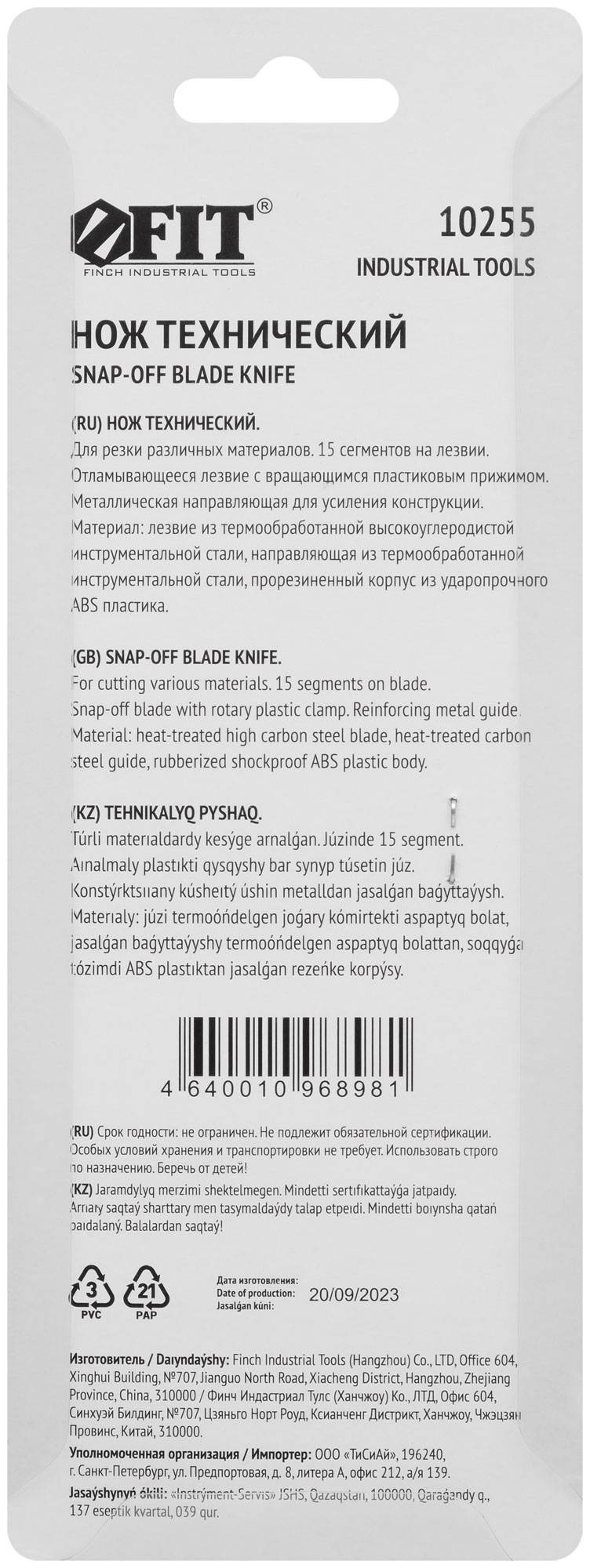 «Отламывающееся» лезвие 18 мм, 15 сегментов. PP Пластиковый прорезиненный корпус, металлическая направляющая. Лезвие из высокоулеродистой стали SK-5. Вращающийся пластиковый прижим.
