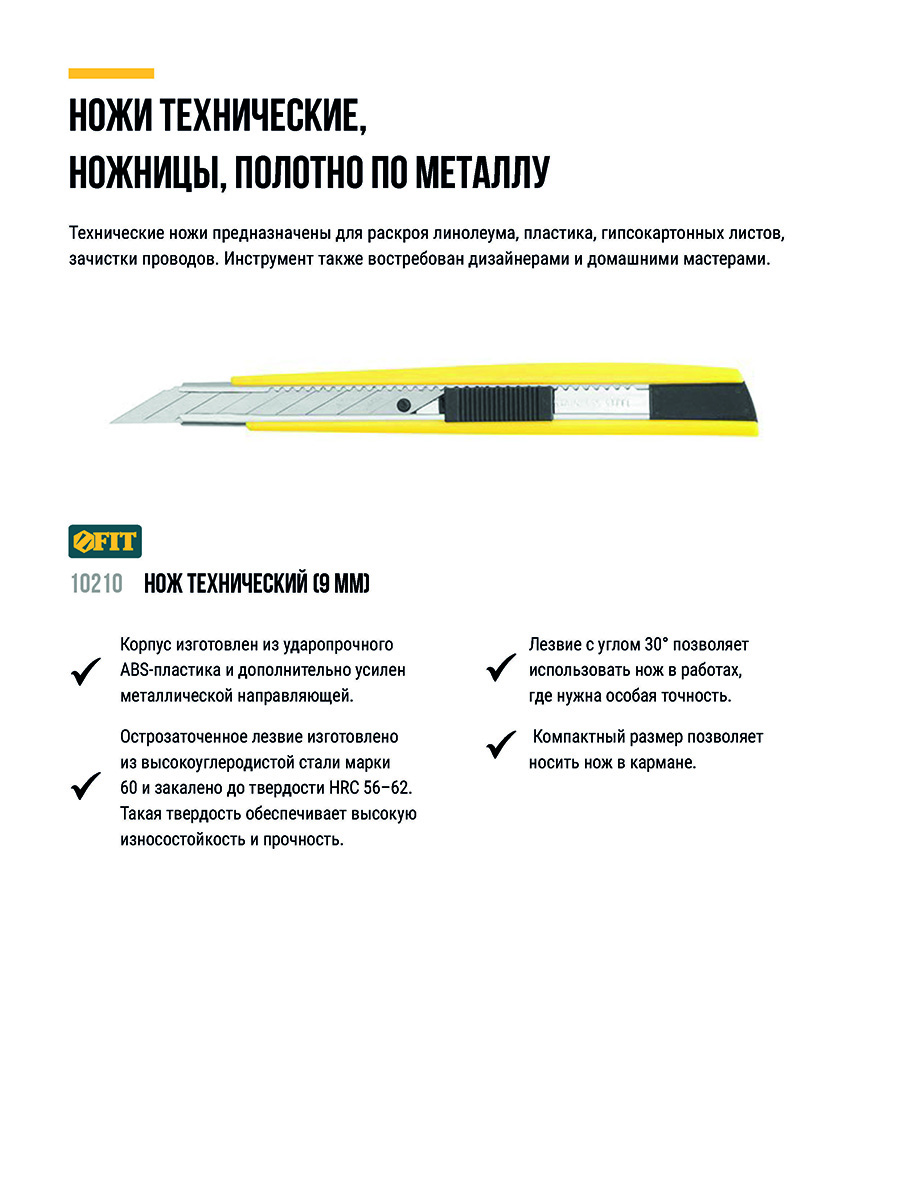 «Отламывающееся» лезвие с пластиковым прижимом. Материал: ударопрочный ABS пластиковый корпус, усиленный металлической направляющей, лезвие из высокоуглеродистой стали. Упаковка: п/э пакет с подвесом.