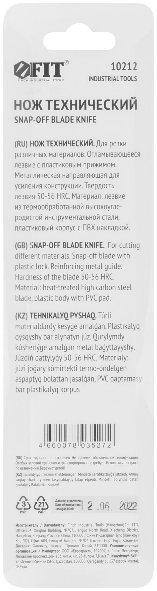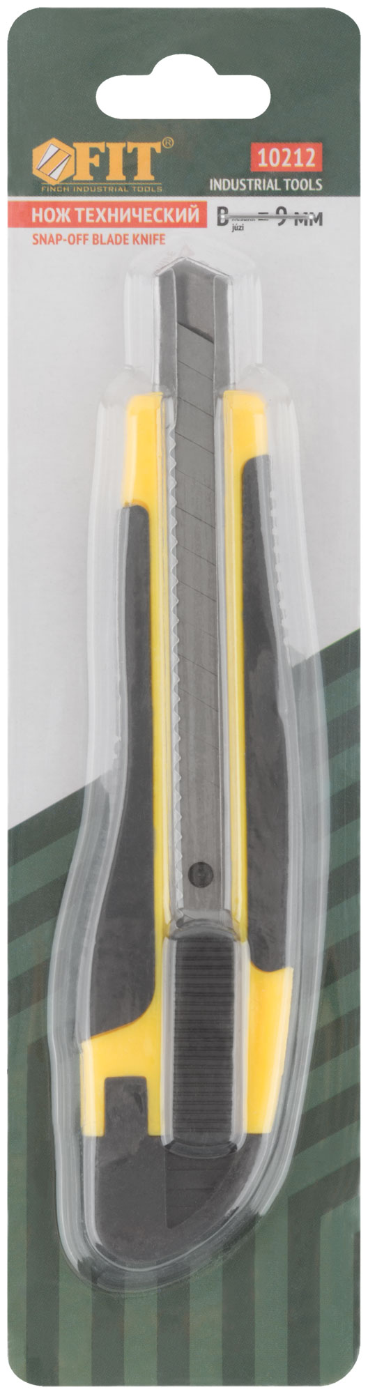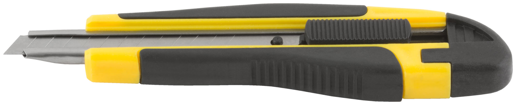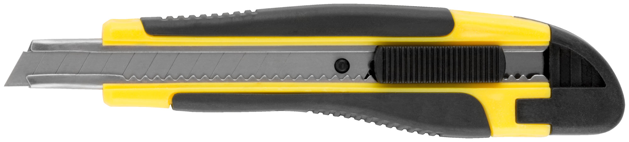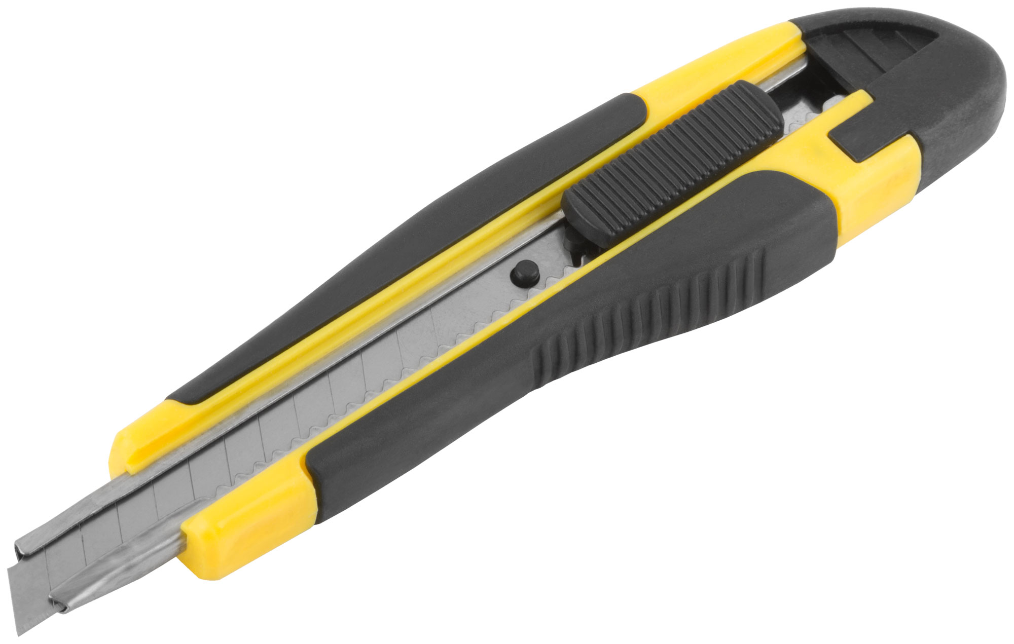 «Отламывающееся» лезвие с пластиковым прижимом. Материал: прорезиненный пластиковый корпус, усиленный металлической направляющей, лезвие из высокоуглеродистой стали. Упаковка: блистер.