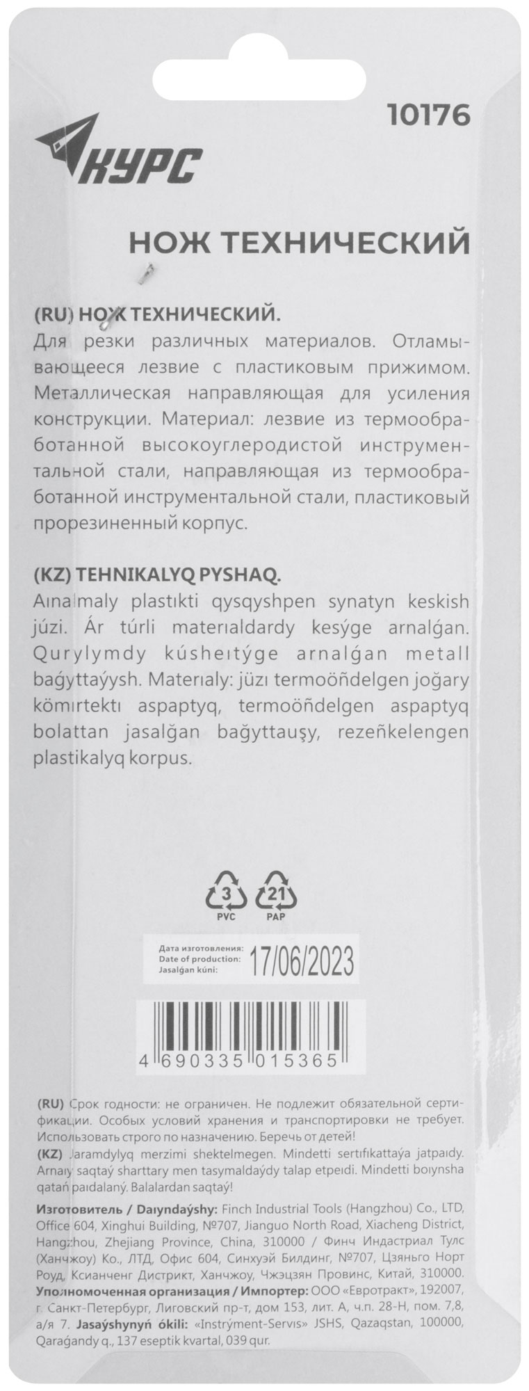 «Модерн». Сегментированное лезвие из высокоуглеродистой инструментальной стали, автофиксация. Пластиковый прорезиненный корпус, усиленный металлической направляющей. Упаковка: блистер.