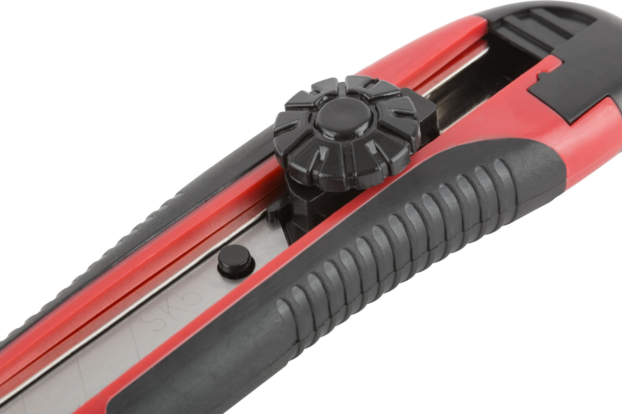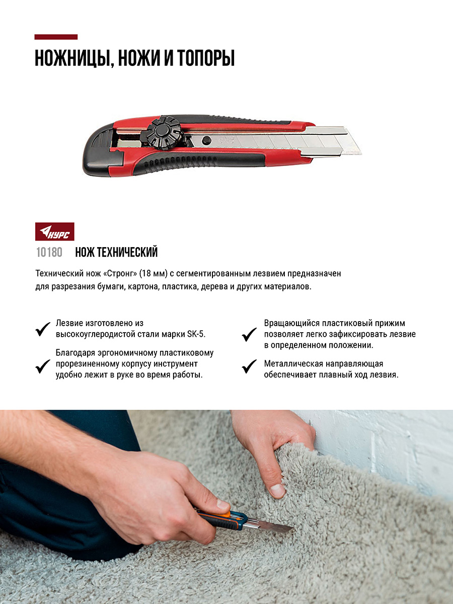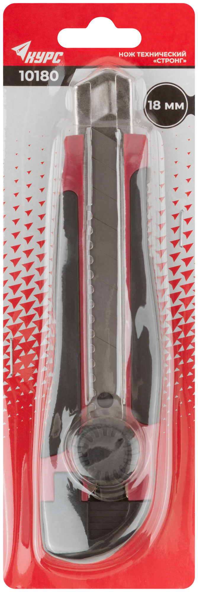 «Стронг». Сегментированное лезвие из высокоуглеродистой инструментальной стали SK-5. Вращающийся пластиковый прижим. Пластиковый прорезиненный корпус, усиленный металлической направляющей. Упаковка: блистер.