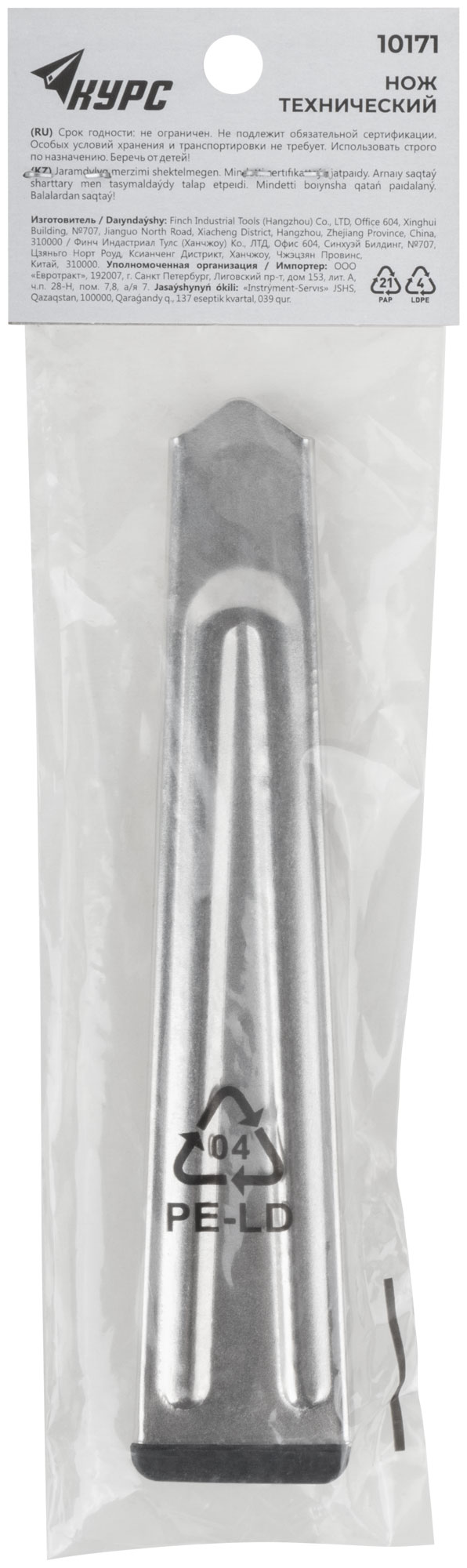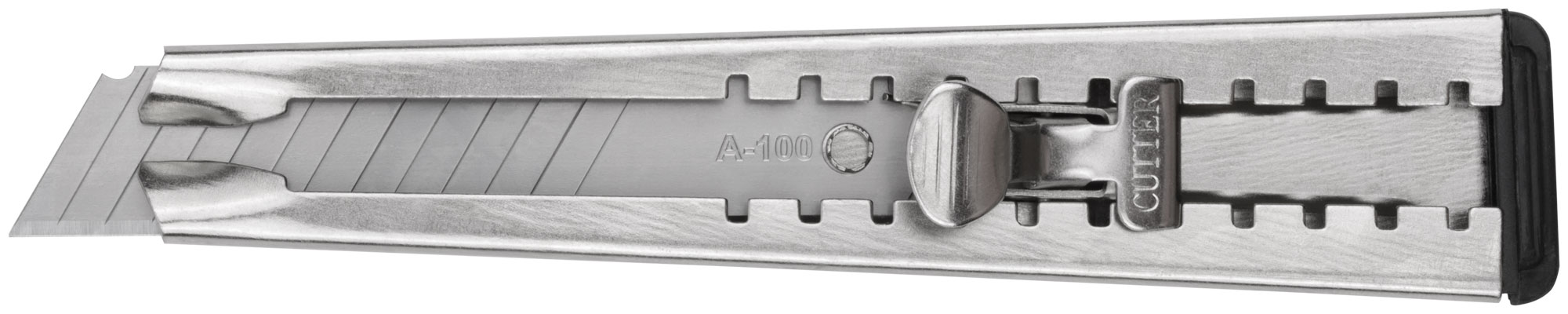 «Техно». Сегментированное лезвие из высокоуглеродистой инструментальной стали состоит из 15 сегментов. Металлический корпус. Металлический фиксатор лезвия. Материал: инструментальная сталь, пластик. Упаковка: п/э пакет с картонным подвесом.