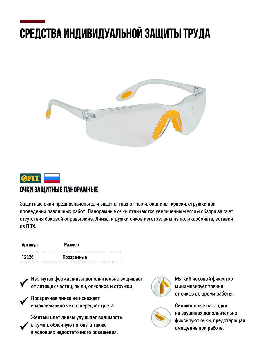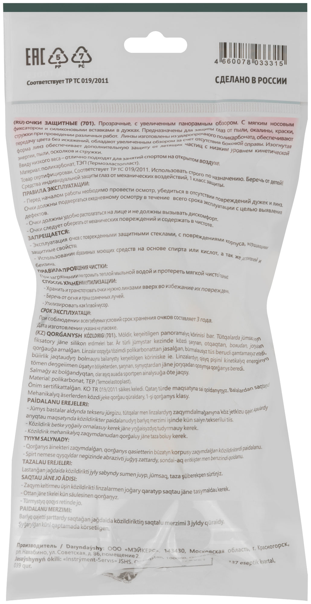Прозрачные. С мягким носовым фиксатороми силиконовыми вставками в дужках.Предназначены для защиты глаз от пыли, окалины,краски, стружки при проведении различных работ.Материал: линзы и дужки – поликарбонат, вставки– ПВХ. Упаковка: п/э пакет с подвесом.