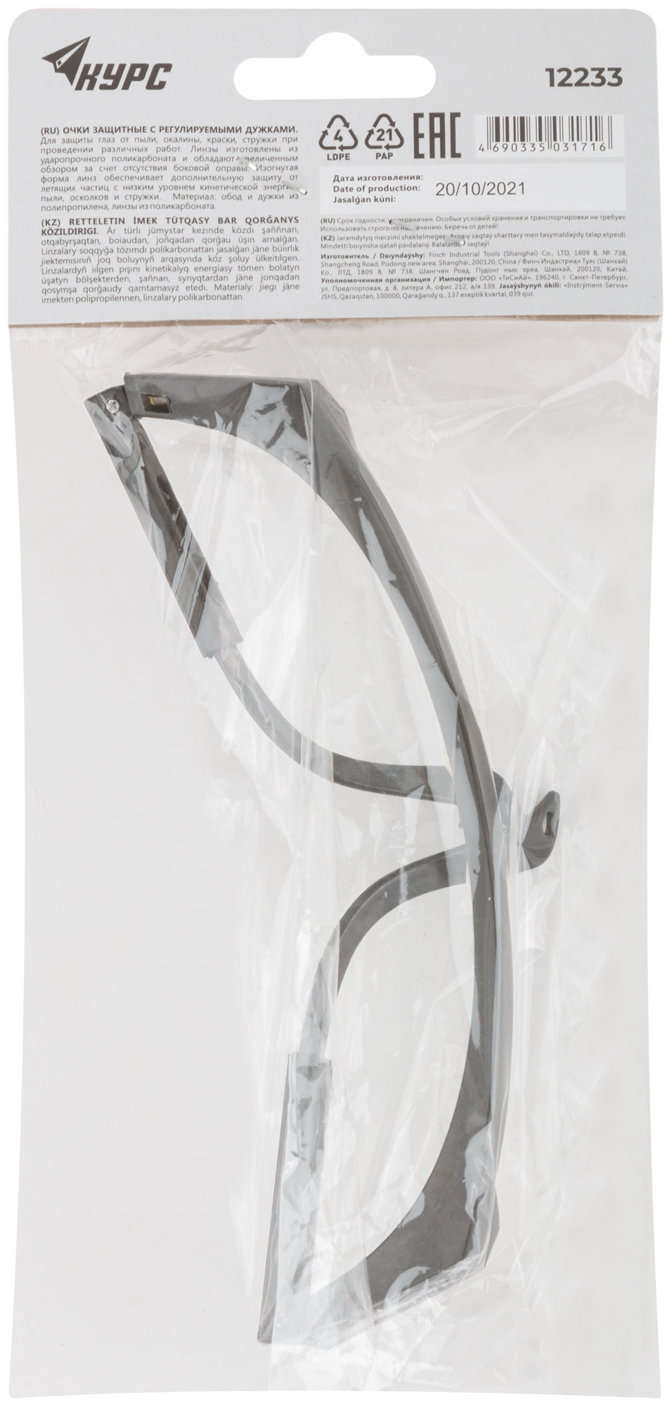 Прозрачные. Предназначены для защиты глаз от пыли, окалины, краски, стружки. Регулируемые по длине дужки. Материал: обод и дужки из полипропилена, линзы из поликарбоната. Упаковка: П/Э пакет с картонным подвесом.