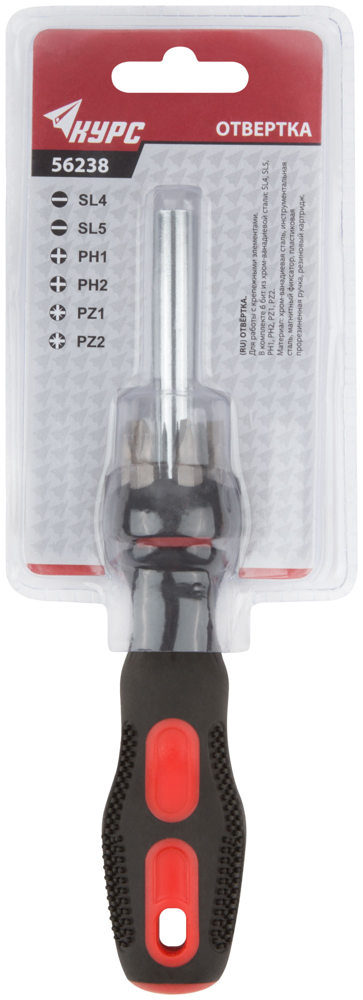 Для работы с крепежными элементами. В комплекте 6 бит (L=25 мм) - SL4, SL5, PH1, PH2, PZ1,PZ2. Материал: отвёртка из инструментальной стали, биты из хром-ванадиевой стали, пластиковая прорезиненная ручка, магнитный фиксатор. Упаковка: блистер