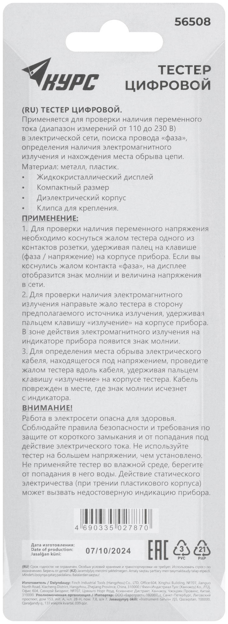 Для проверки наличия напряжения в электрической сети (от 12 до 220 В), поиска обрыва цепи, определения наличия электромагнитного излучения. ЖК-дисплей. Материал: металл, пластик.Упаковка: блистер.