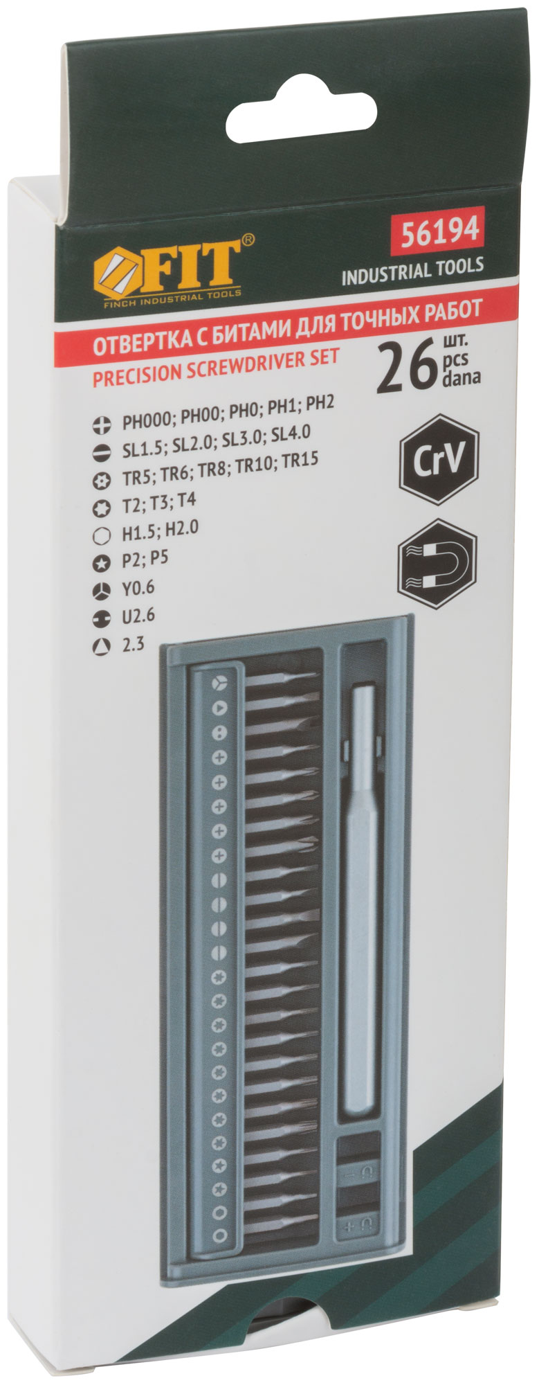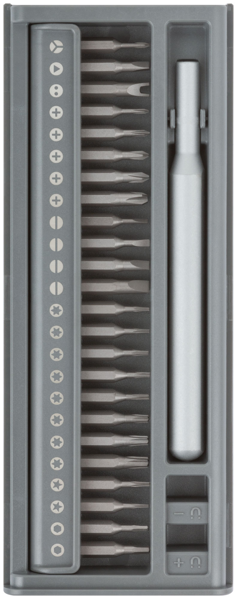 Для точных работ. Отвертка для бит с магнитным фиксатором, биты 24 шт: SL1.5, SL2.0, SL3.0, SL4.0; PH000, PH00, PH0, PH1, PH2; Torx с отверстиемTR5, TR6, TR8, TR10, TR15; T2, T3, T4; H1.5, H2.0; Pentalobe P2, P5; Y-тип Y0.6; U-тип U2.6; Triangle 2.3; намагничиватель / размагничиватель. Материал: биты из хром-ванадиевой стали, отвертка из алюминиевого сплава со встроенным магнитом. Упаковка: кейс из ударопрочного ABS пластика вкартонной коробке.
