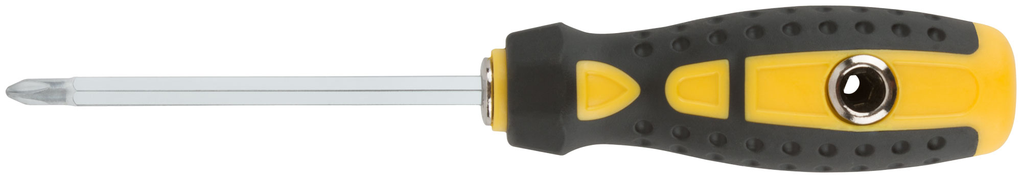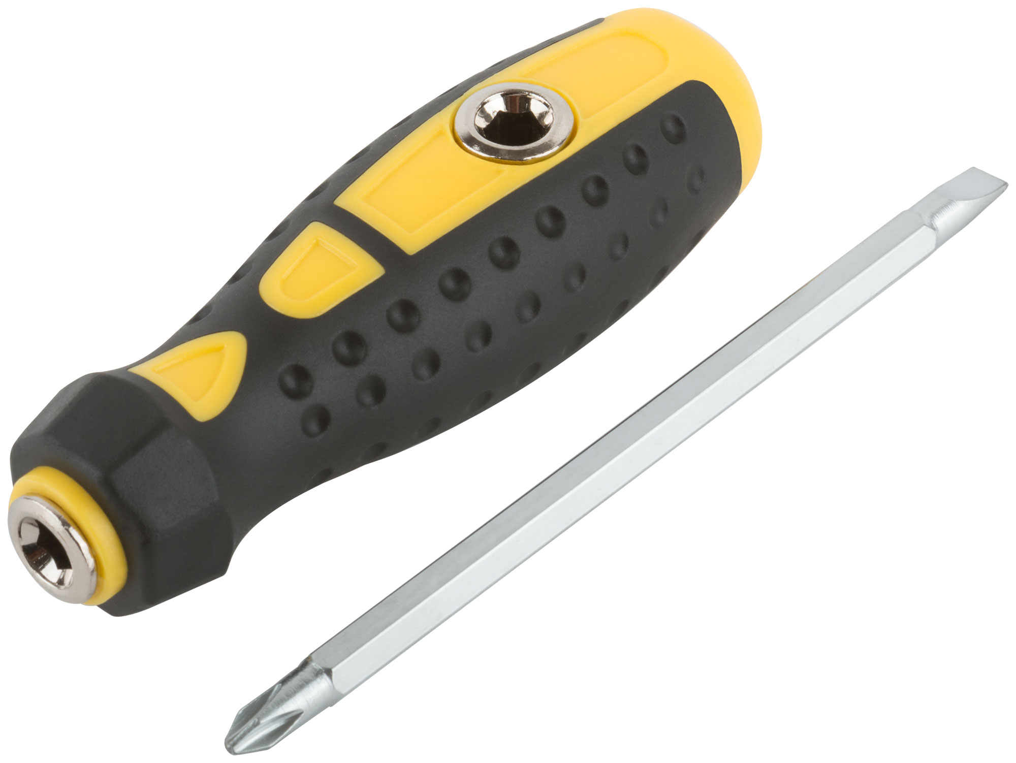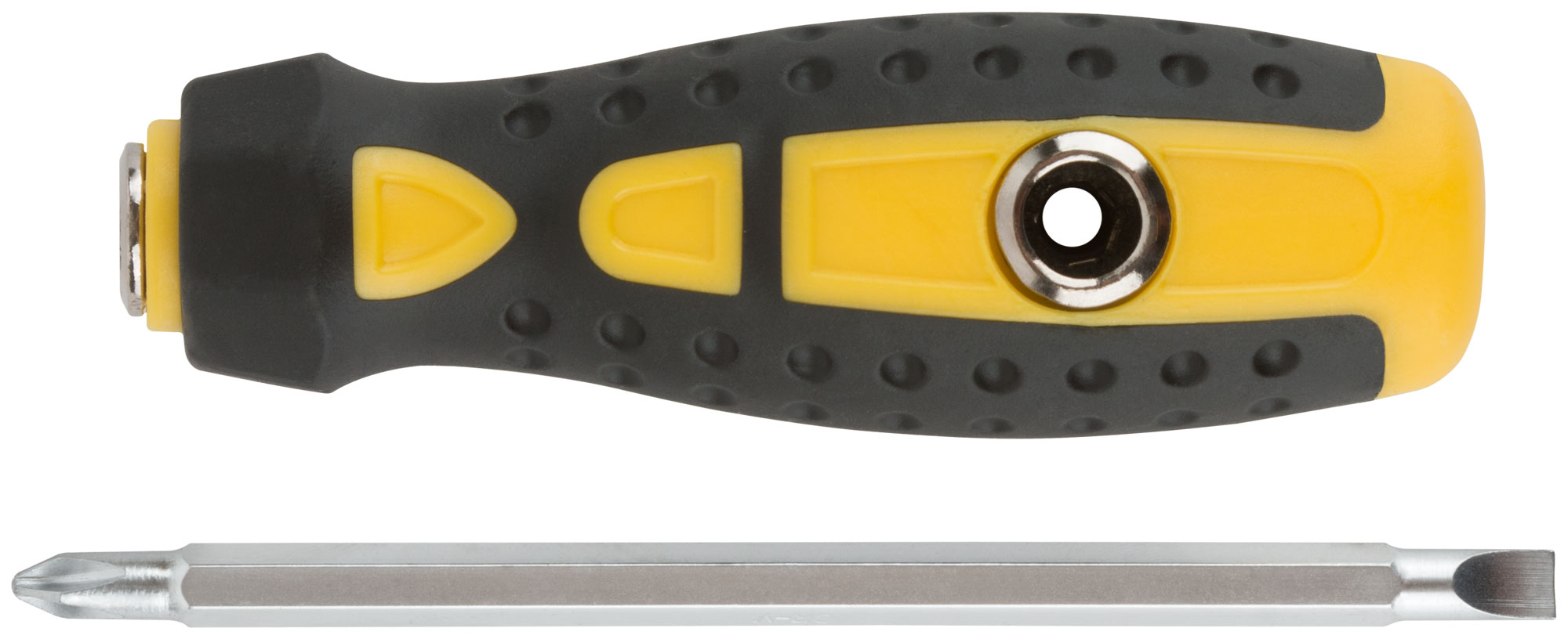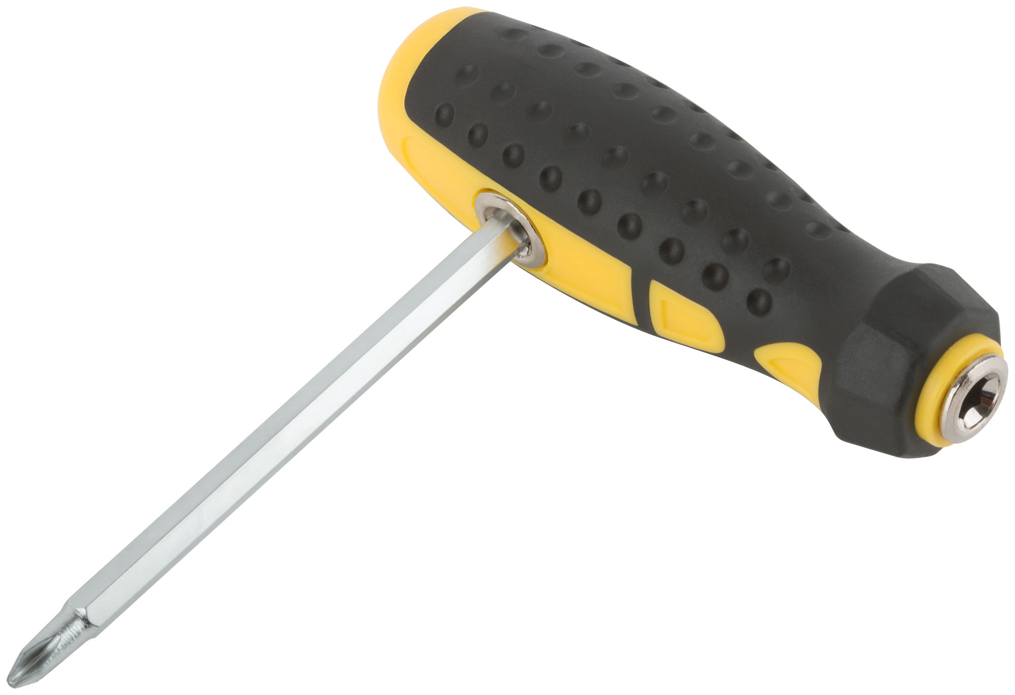 С переставным жалом. С дополнительным установочным отверстием на ручке для работы в качестве Т-образной отвертки, что позволяет снизить нагрузку при работе. Материал: жало из хром-ванадиевой стали, пластиковая прорезиненная ручка. Упаковка: блистер.