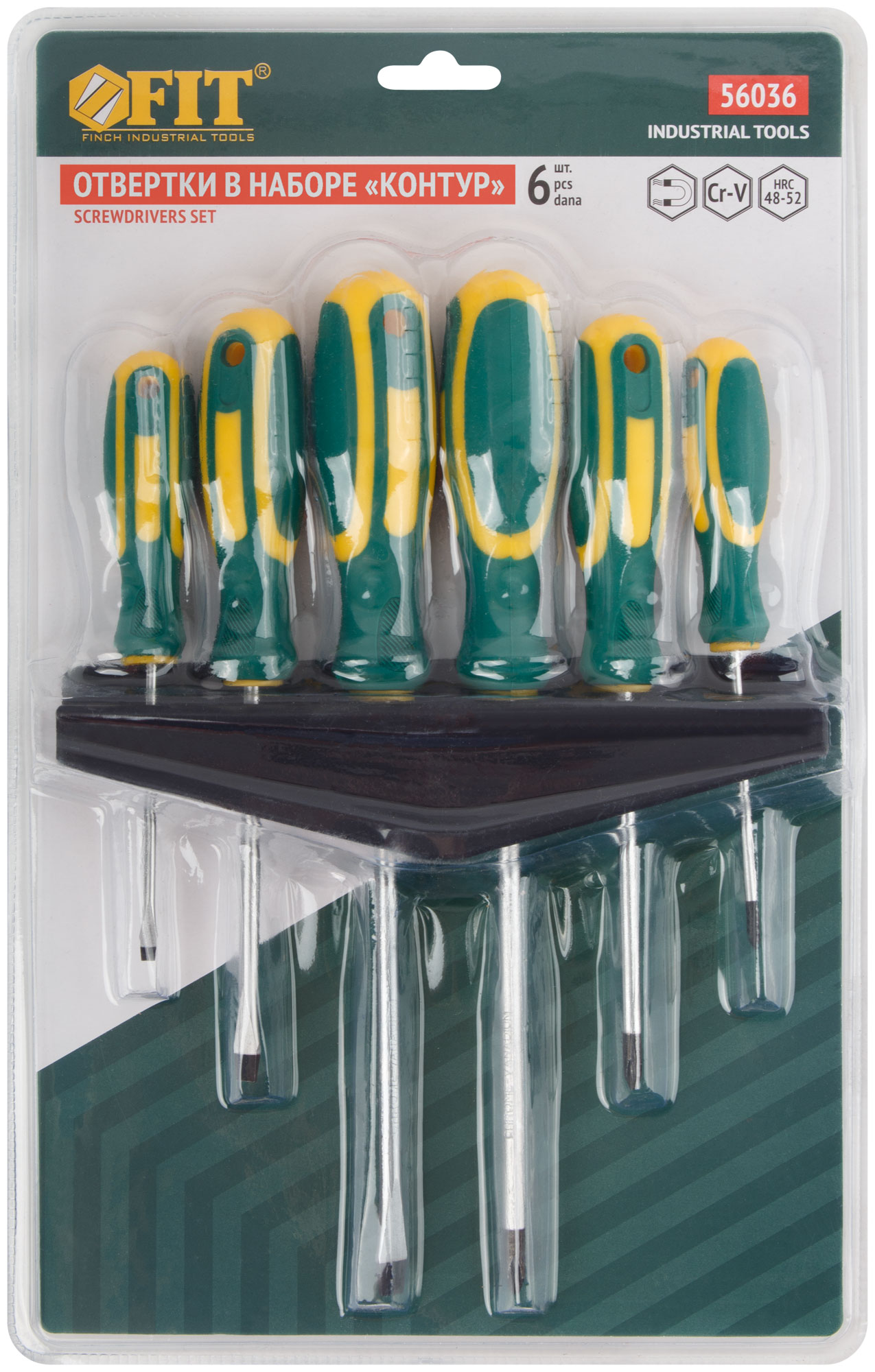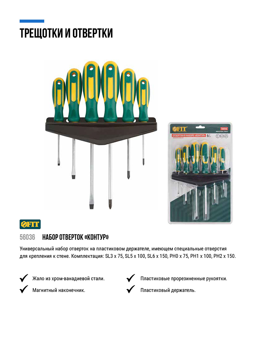 «Контур». Набор 6 шт. на пластиковом держателе. Отвертки: SL3 x 75, SL5 x 100, SL6 x 150, PH0 x 75, PH1 x 100, PH2 x 150. Материал: жало из хром-ванадиевой стали, магнитный наконечник, пластиковая прорезиненная ручка. Упаковка: блистер.