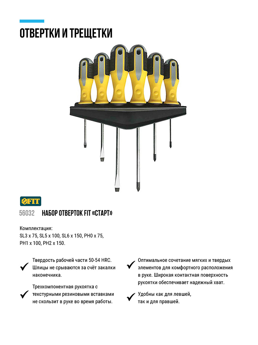 «Старт». Набор 6 шт. на пластиковом держателе. Отвертки: SL3 x 75, SL5 x 100, SL6 x 150, PH0 x 75, PH1 x 100, PH2 x 150. Материал: жало из хром- ванадиевой стали, магнитный наконечник, пластиковая прорезиненная ручка. Упаковка: блистер.