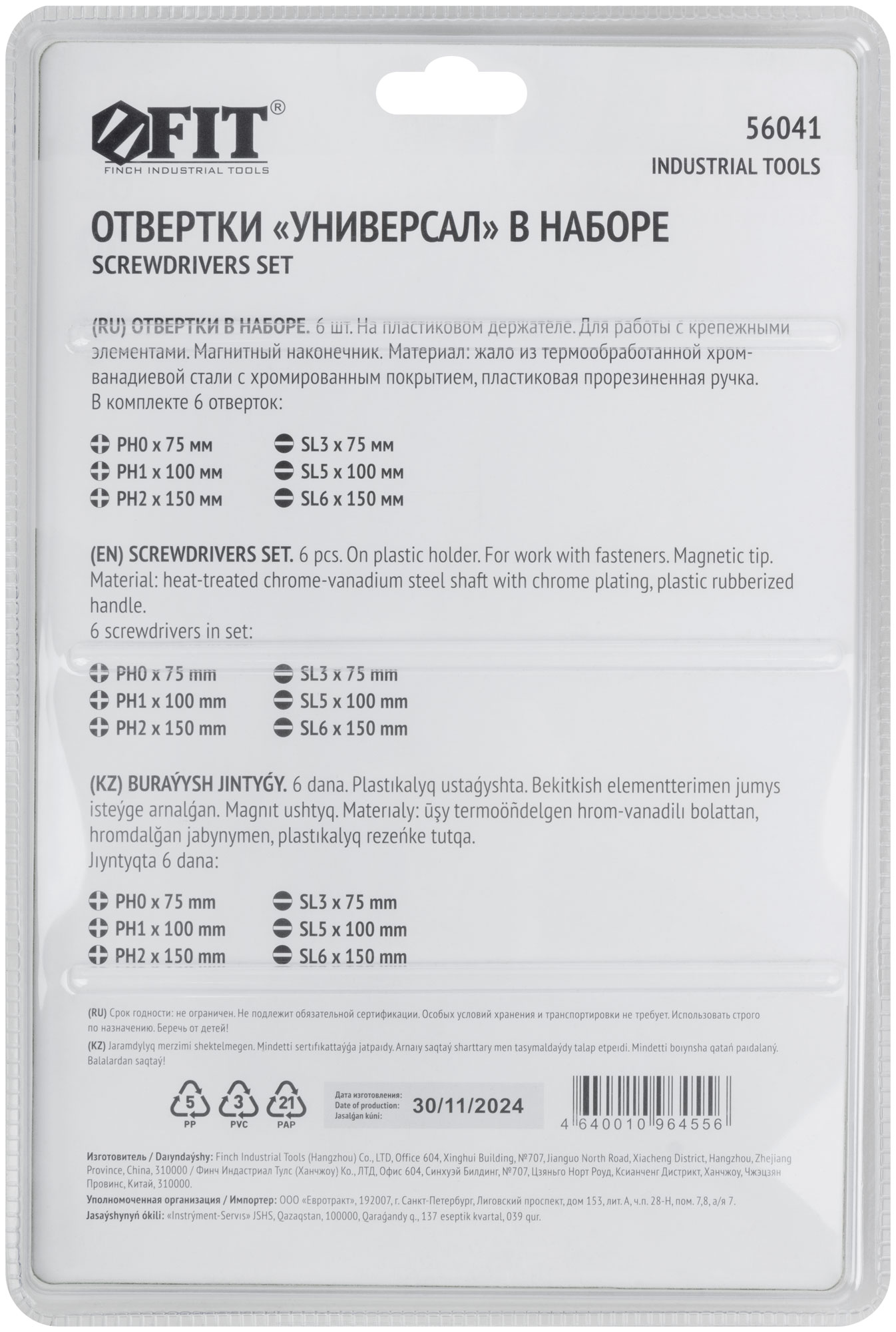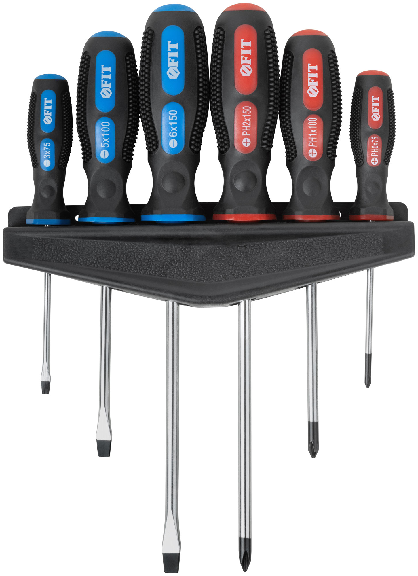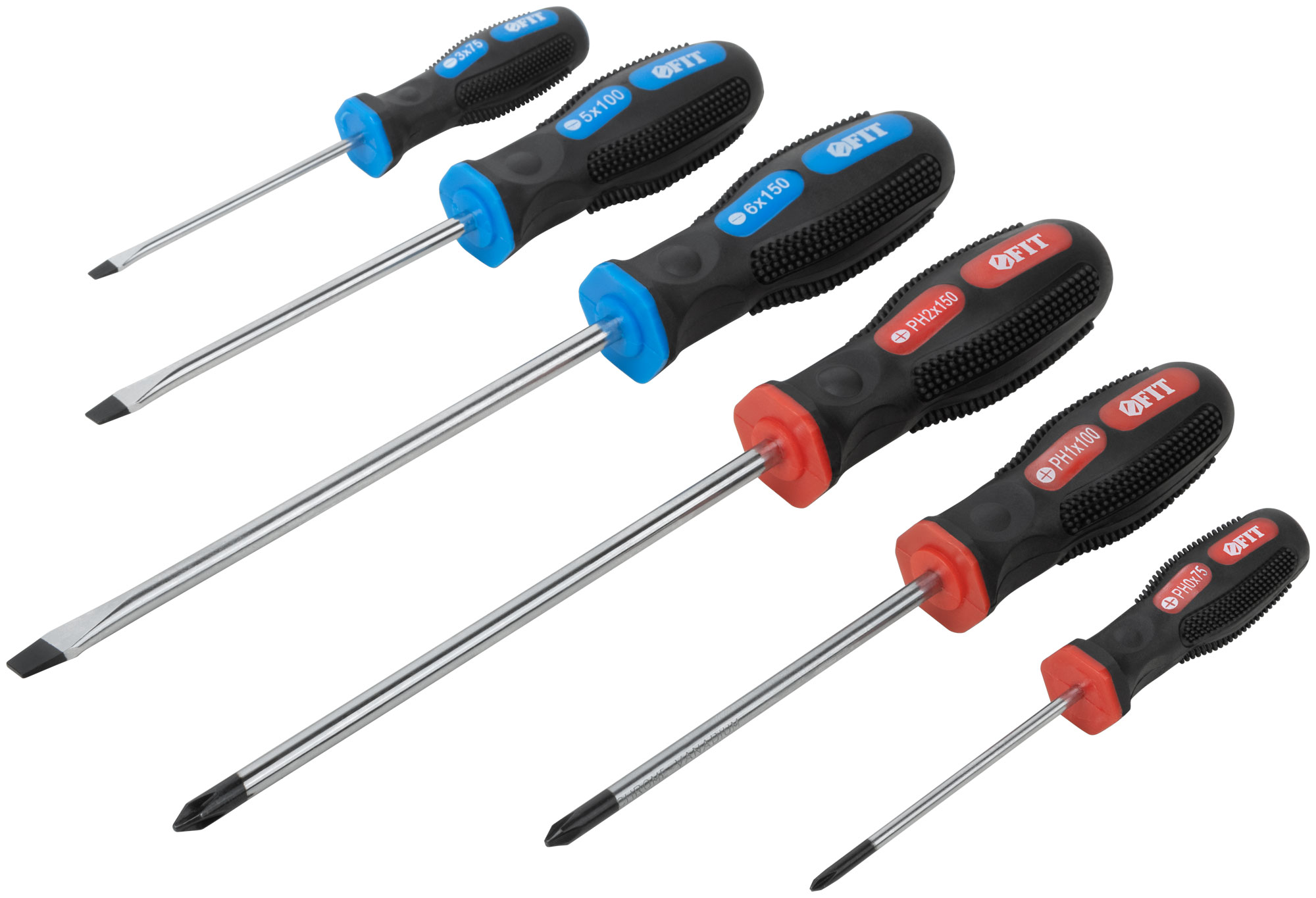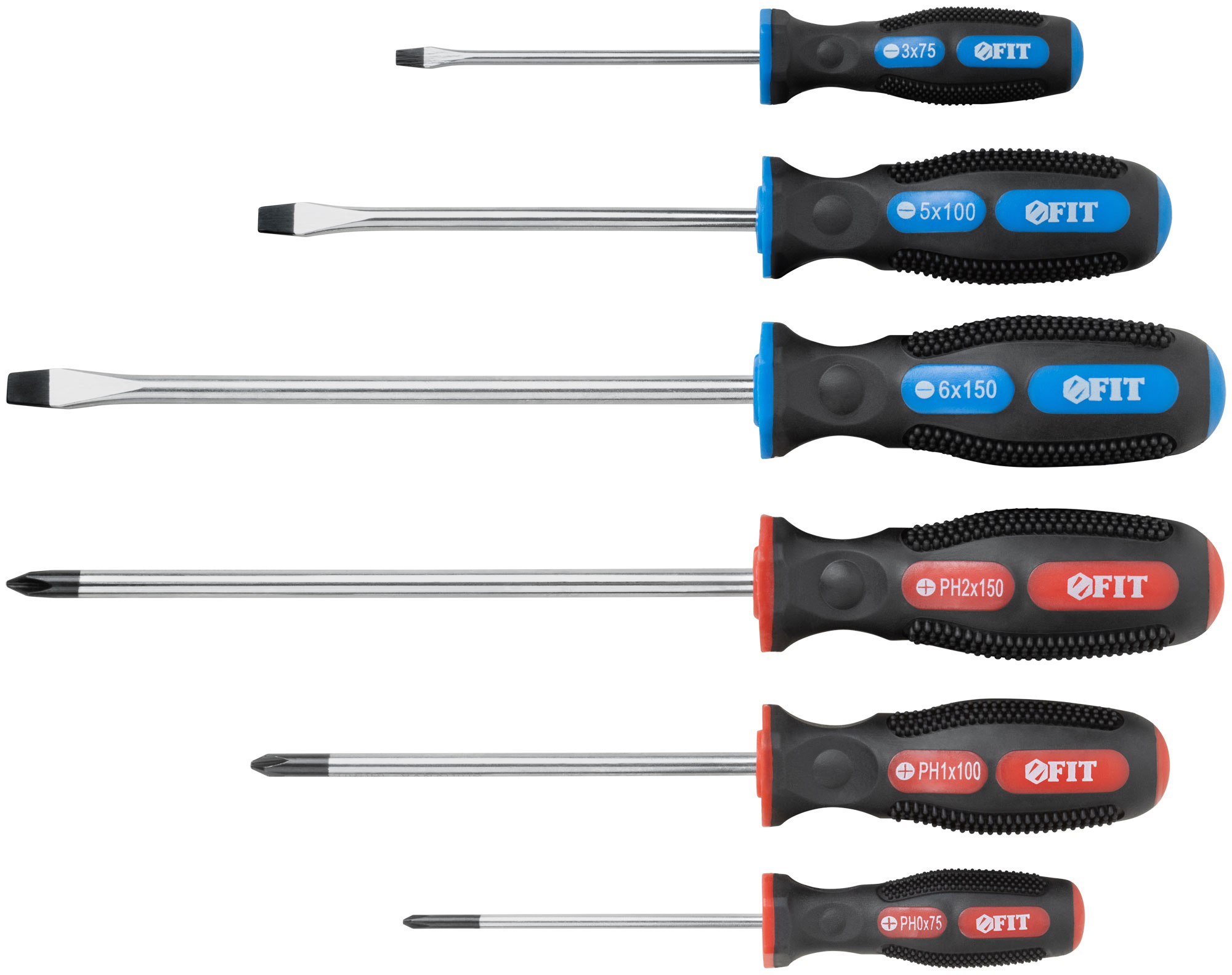 SL3 x 75 мм; SL5 x 100 мм; SL6 x 150 мм; PH0 x 75 мм; PH1 x 100 мм; PH2 x 150 мм. На пластиковом держателе. Материал: жало из хром-ванадиевой стали, магнитный наконечник, мягкая прорезиненная ручка. Упаковка: блистер.